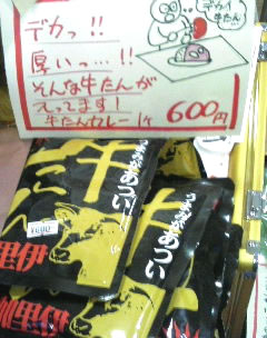 先日・・・とある食品会社の営業の方とおしゃべり。「まずは、このサンプルを食べてもらって・・それからお返事をください」と言われまして・・いただいたサンプル2食を妻と二人で食べまして・・・今日・・その営業の方が来てくれたのですが・・・妻と二人・・そしてその方も含めて3人で・・・「あの牛たんカレー、すごいデカイ牛たんでしたね。」3人とも・・・牛たんの大きさ、厚さに驚いた。「社長・・・置いてもらえますか??」「当然。あの牛たんの厚さを見たら・・・売りたくなりました。」ということで・・・牛たんが厚い、デカイそして柔らかく煮込まれている。名刺サイズくらいの牛たんそして・・・ど厚い牛たん。これは・・カレーそのものの味もいいのだか、牛たんの厚さと大きさに感動したカレーであった。牛たんカレー。値段はまあまあお高いが・・・・・この牛たんの厚さとデカサ。これがウリです。あっ・・・地方発送もしています。まだ・・スーパーではならんでいない商材と聞いているが・・・