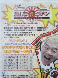 先日・・・あるお笑い芸人さんが大村屋酒店、当店に突然やってきて・・・打ち合わせもナニもなしに・・・突然ロケがはじまった・・というのをこのブログで書いたのだが・・・覚えているだろうか。そのときのブログはコレさて・・昨日、当店での追加のロケ・・まあ店内の様子だとか、お店の外観などを追加でロケをした。というわけで・・・当店がテレビで放映されます。大村屋酒店に突然やってきた芸人さんとは・・・なんと・・キャイ~ンのウドちゃんだったのです。10月4日の土曜日・・・名古屋テレビ(メーテレ)、午前9時30分からの「ウドちゃんの旅してゴメン、静岡・気賀編」で・・当店が放映されます。名古屋テレビ以外でも・・・テレビ埼玉だとか京都放送、神戸サンテレビ・・高知放送でも放映されるので・・・見てくださいね。名古屋のてっちゃん・・・「もしかして・・ウドちゃんの旅してゴメン?」と・・ずばり正解を言ってくれたのだけど・・・まだあの段階では・・・当店が放映されるかどうか・・解らなかったのだ。だから名古屋のてっちゃん・・ズバリ正解。あのときはまだだまっていて・・ゴメン。みんな・・10月4日、朝9時30分は・・・名古屋テレビ・・メーテレを見よう。しかし・・・我が町・・細江町気賀では・・・名古屋テレビが映らない。だれか・・・興味あるかた・・・ダビングしてくれぇ。
