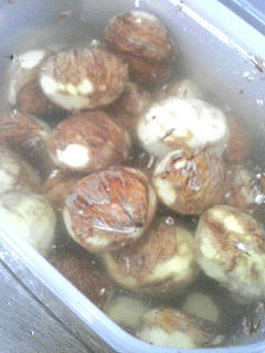 親戚から生の栗をたくさんいただいた。ではでは・・・栗ご飯にしようと鬼皮を剥いて今、アク抜きのため・・・渋皮ごと水につけています。おいら・・・栗ご飯って大好きなんだけど・・・私の父親と娘は普通の・・ただ普通に茹でただけの栗が好き。ゆでただけの栗を包丁で半分に割ってそれをスプーンですくって食べるのが好きなんだと。だから・・いただいた栗のうち・・・半分は栗ご飯に・・・残りの半分はただ茹でるだけにしようと、鬼皮は剥かないでおきました。さてさて・・栗の料理・・・栗ご飯か、茹でただけの栗しか思いつかない。だれか・・・栗を使った料理ナニか教えてよ・・・ただし、栗羊羹だとか、モンプランというようにお菓子とか、栗の渋皮煮のレシピはいりません。あくまでも・・・おかずとかになる栗の調理法・・・なんかない??漫画「クッキングパパ」では・・生の栗と鶏の煮込みのレシピが載っていたが・・それ以外になんかある??栗の甘露煮もダメよ。あれは甘いから・・・