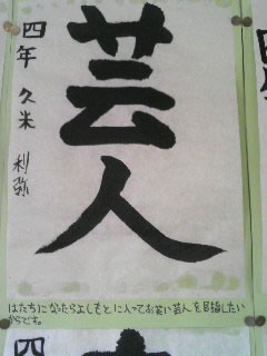 本日、子ども達の通う小学校の参観会。最初に2年生のアキハを見て・・・次に別の校舎のお兄ちゃんのクラスへ・・教室の外側の壁に・・・クラス全員のお習字が貼ってあった。右側から順番に一人一人の「書」を見ていく私と妻。そしたら・・・最後の最後のほうで・・・一番左側に・・・突然の「書」に・・・私も妻も・・・「んっ???」そして・・大笑い。他の子どもさんは・・・「元気」とか・・「友達」などと書いているのに・・・