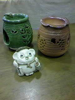 当店では、「茶香炉」を展示、販売しております。これは浜松舘山寺温泉の一角で陶芸教室をされている「つれづれ窯」の井口先生の作品なんですが・・・この茶香炉の上のお皿の部分に、お茶っ葉をいれて、下からローソク(卓上用ミニ)で焚くのです・・お茶の葉が焚かれて・・・すごいいい香りです。まるで新茶の季節のお茶屋さんの前のような・・イイ香り。なんだかほっとする香りに包まれます。茶香炉でお茶の葉を焚いている大村屋酒店へ、ぜひ無遊びに来てください。丁寧に炒ると・・ほうじ茶に生まれ変わりますが・・・当店では・・まだ試したことがありません。ちなみに・・横のタヌキは・・・「大村屋さんのご主人(私のことね)の顔を思い浮かべながら造ったんですよ」と井口先生のお言葉徳利ぶらさけだ・・・タヌキの表情がイイですね。