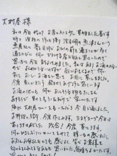 大村屋様私は今日はじめてお店に入って少し買い物をした者です(前略)おたくの前を通ることが多く通るたびに 何かひきつける店だなぁと思っていたので思いきって 今日 立ちよってみました。(中略)皆でお客様を迎えてくれるなあとも思いました。気持ちがよかったです。思い切って 入ってよかった!てな事で お礼にFAX入れます。(後略)朝、お店に来たら・・・一枚のFAXが届いてました。魂のごちそうです。ありがたいことです。