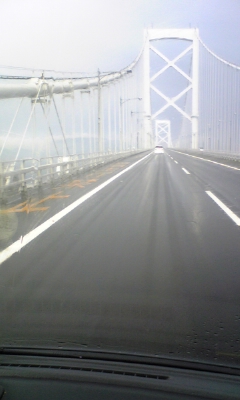 今回の「海を渡る!剪定師!植木屋ひとり」で、おおいにお世話になった方、全てに大感謝ありがとうございました。仕事をさせて頂き、宿泊の場所も提供していただいた、施主様同行してもらい手伝ってくれた先輩施主の従業員の皆様美人のスタッフさん施主のファミリーさん最終日に現れたスペシャルゲストさんとにかく、大感謝!!何から書いていいか・・・。いっぱいあり過ぎ。。まずは、海を渡る模様から明石海峡大橋、横断中!!「海を渡る」片道約350キロ。高速オンリー。軽トラで同行してもらった先輩と交代で運転しながら。。約5時間。ナビ役の先輩が本領発揮で迷う事なく予定とうり到着できました。ひとりだけならいろんな所で降りてたでしょう。。都会の高速アンド有料は、よう、わからん。ETCもナビもなかったけど、勢いとノリですべて◎ちなみに、橋からの絶景は眺める余裕はなし!強風と雨で。。