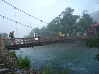 7月17日(土)晴れ仕事を終えてから持ち物の最終確認。横になればちょっとは休めるのだが、興奮しているせいか眠れない。それもそのはず、槍ヶ岳はNHKの山の番組で見ていて、憧れの山だ。まさか登ることが現実になろうとは・・・駅近くの駐車場に車を止めて駅まで歩く。荷物が多い。TTRのバスが来て、乗り込む。 0:50 新前橋駅発参加者は我々4名を含めて9名。それに添乗員さん。天候が悪かったせいか5名ほどのキャンセルが有ったらしい。バスの座席は二人分使え、余裕がある。 1:35 横川(5分休憩) 3:12 梓川 眠ろうとしても眠れない。 タイヤの回転音が異様に耳に響く。4時過ぎに沢渡に着いたがシャトルバスが来るまで待機する。 5:00 沢渡発 シャトルバスで上高地に向かう。 5:39 上高地バスターミナル着 早朝なのにかなり賑わっていた。此処で朝食をとる。バスの中でおにぎりを食べたせいかあまり食は進まない。 6:10 上高地バスターミナル発なだらかな広い道を歩き始める。 6:23 かっぱ橋 山と澄んだ川の流れとつり橋の風景が幻想的で美しい。 6:27 ビジターセンター トイレ休憩(13分間) 6:48 休憩休憩はちょくちょく取るが、結構速いペースで歩いている。皆足が達者のようだ。 7:25 明神(10分休憩) 8:25 徳沢キャンプ場(11分休憩) 8:40 徳沢園(20分休憩) 珍しいピンク色をしたショウキラン発見。10:00 横尾キャンプ場(19分休憩) 10:50 槍見河原にて昼食(34分休憩) 11:45 一の俣(10分間休憩)この辺りから上り坂になる。梅雨が明けたのか日差しが強く、いい汗を沢山流した。12:30 槍沢ロッヂ着 我々TTRは2階の部屋。中央に枕を並べて寝るのだ。身長のある人なら壁に足が着いてしまうほどだ。戴いたビールがなんと美味しいこと。15:00~入浴入浴時間が待ち遠しかった。石鹸禁止で浴槽に浸かるだけだが、汗を流せるだけでも嬉しい。17:00~夕食 夕食が美味しかった。ご飯味噌汁を2杯ずつおかわりをしてしまった。山の中に来て、こんなに美味しい食事にありつけるとは思いもよらなかった。明日へのパワーを蓄積して寝ることにした。前の日、一睡もしていなかったが、いびきの音で、なかなか寝付かれなかった。睡眠導入剤を戴いてどうにか眠りについた。