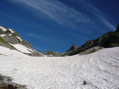 7月18日(日)快晴昨夜は布団に入っても寝付かれず、睡眠導入剤を戴いて飲む。いつの間にかぐっすり眠ってしまったようだ。3:19 起床3:42 槍沢ロッジ発ヘッドライトをつけて出発する。3:57 一回目の休憩寒いと思い、長袖シャツの上に半袖シャツを着て、ウインドブレーカーを着込んだのだが歩き始めたらたちまち汗ばんできたので長袖シャツ1枚になり歩き始める。4;14 ババ平(5分休憩)此処は以前槍沢ロッジがあったところだそうだ。石の土台などが残っていた。所狭しとキャンプをする人のテントが張られていた。夜明け前の周囲の山々が黒っぽく高く聳えていた。4:45 槍沢大曲り(10分休憩)大分空が明るくなってきた。今日もいい天気らしく青く澄んでいた。5:12 休憩 万歩計は3900歩と表示されていた。5:38~6:00 天狗原分岐(休憩・朝食(散らし寿司))ショウジョウバカマ、丈の短いサンカヨウも咲いていた。6:25 水のみ場(5分休憩)4281歩ハクサンイチゲ、シナノキンバイ、ナナカマドの花が咲いていた。6:40~6:50 槍ヶ岳が見えてきた所(休憩)念願の槍ヶ岳が雪渓の向こうに聳えている。アイゼンは持ってきたが必要ないだろうとのことで槍沢ロッヂに置いて来た。雪渓は滑りにくく慎重に登れば大丈夫のようだ。~7:10 坊主岩(休憩)槍ヶ岳を開山した播隆上人ゆかりの坊主岩で中が洞穴のようになっていてお地蔵様が祭ってある。7:30~8:00 休憩・食事急斜面をジグザグに登って行くと槍ヶ岳山荘のある槍の肩に着く。9:25 槍ヶ岳登山開始山荘にリュックを置き、水とカメラをなっぷサックに入れ、いよいよ槍ヶ岳登山の開始だ。添乗員さんに指示された通りに3点支持で慎重に登って行く。10:39 槍ヶ岳から下山槍ヶ岳山荘へもうこの山に登ることは無いだろうと思うと、お財布の紐が緩む。バッジやTシャツ、タオルマウラーやらを記念に買い込む。11:45 槍ヶ岳山荘発ひたすら下る。足は大分疲れているようだ。11:52~11:55 水場天気が良く、水は飲み干してしまった。湧き水が冷たく美味しい。振り返れば槍ヶ岳がだんだん小さくなってくる。鋭く尖った槍ヶ岳ともそろそろお別れです。 13;13~13:20 天狗原分岐(休憩)脹脛が痛くなってきた。13:44~14:00 休憩13:57~14:05 槍沢大曲り(休憩)14:58 槍沢ロッジ着 19619歩やっとのことで槍沢ロッジに着いた。15:30~風呂 今晩の宿泊者は前日よりも少なく、風呂もゆっくり入ることが出来た。足をマッサージするが、触るだけでも痛い。17:00~夕食 ご飯もおかずも美味しい。今日もご飯・味噌汁をおかわりして残さず美味しくいただきました。眠ろうとしても寝付かれず、下に降りて行き、CCレモンを飲んだりコーヒーを飲んだりする。2時ごろには目が覚めてしまい、大人しく布団の中でじっと我慢。