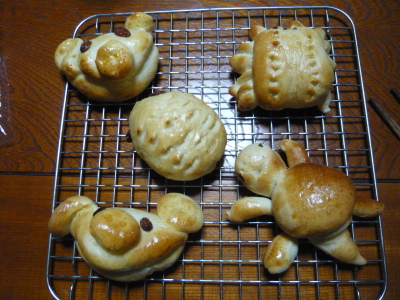 10月10日(日)晴れ今日は幸佑が来るので大掃除。危険な物は手の届かないところへ片付けたりした。何でもいじりたがるので気をつけなければならない。幸佑たちは4時半ごろ来た。ピアノを叩いたり、家の中を走ったり、元気に走り回っている。夕飯はご飯と、煮物(里芋、大根、人参、椎茸)、シシャモ、トマト、グレープフルーツ、黒ゴマ、納豆、味噌汁(里芋、人参、大根)。幸佑はゴマとシシャモが好きなようだ。並行して、動物パンを作ることにした。まだ幸佑が作るのは無理なようだ。(豚パン3個、蟹パン2個、鳥パン1個、ハリネズミパン2個、亀パン1個が出来た。風呂は浴槽の中で腰掛けることができるので、なかなか出ようとはしなかった。風呂から出たら家が恋しくなったのか、「おうちに たえる。おうちにたえる。と連発していた。(かがまだ言えないので、たになってしまう。)9時半ごろ幸佑は両手を振って帰っていった。幸佑が帰ってから粗挽きマスタード入りウインナーロールパンを焼く。明日は巻機山に行く予定。