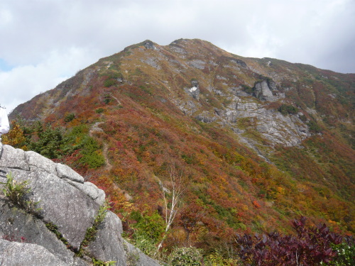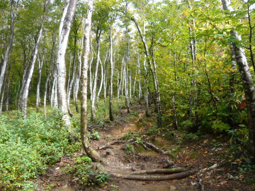 10月11日(月)群馬 晴れ 巻機山 早朝雨 午前曇 午後から青空が見え始める 4:15 起床前日ほぼ山行きの準備終えていたが、リュックにつめて完了。母屋の義母に昨夜焼いたパンと野沢菜チリメン雑魚入りおにぎり、おかず(山に持って行く物と卵焼き)、梨を義母の部屋に置く。ヘルパーさんが作ってくださった薬入れに先週の土曜日から朝昼晩と分けて毎朝1回分ずつ入れて置いた。ところが、義母が全部の薬を入れてしまい、飲んだ確認が出来なくなってしまった。一昨日一袋ごと日付を書いて朝用、昼用、夜用のところへ日付順に入れておいた。だが、その日の日付が分からないらしく、翌日の分まで飲んでしまうので、過ぎた日はカレンダーに×印をし、その日に○をつけて様子を見ることにした。 5:30 長女にお昼に様子を見るようにお願いして、集合場所に向かう。 5:50 集合場所着 6:00 出発 参加者5名久しぶりに5人揃っての山行きに会話が弾む。三国山脈の方に太い虹(右下が太く鮮やかだった。)が出ていた。関越トンネルを抜けると一変して雨。朝から天気が回復すると言う天気予報を信じて目的地に向かう。塩沢石内ICで高速を降りて目的地付近に来たらいつの間にか明るくなり、雨が上がっていた。 7:45 巻機山駐車場着まだ、紅葉には1週間早いらしいが、駐車場は満車に近い状態だった。 8:03 巻機山駐車場発 8:09 尾根コース登り口登るに連れて去年登ったときのことを思い出す。雨が上がったばかりなのか、登山道にはちょろちょろ水が流れていた。上り坂も水沢山を越すような急な上りが続く。 8:19 3合目 休憩黄土色っぽい粘土質の層が登山道にむき出しになっている。滑らないように気をつけなければ・・・ 8:41~8:46 4合目 9:06 4合5勺5合目付近からブナ林が始まる。去年の霧に包まれたブナ林も良いが、遠くまでくっきりと見える今年のブナ林も美しい。 9:19~9:29 5合目 曇っていて音はすれど滝は見えず。此処で休憩し、風邪で体調が悪いリーダーは、自分のペースで後から登ることになった。美しいブナ林の写真を撮りながら進む。10:05 6合目展望水沢山以上にきつい上り坂が続く感じがする。かなり歩いた気がするが、やっと3勺だ。10:20 6合3勺10:31 6合7勺此処から7合目までが遠い。終わりそうでなかなか終わらない上り坂が続く。やっとのことで7合目に着く。ちょっとしたガレ場だ。この辺りからドウダンツツジの真っ赤な紅葉をはじめ、赤と黄色とで美しい景色となる。残念ながら遠くまでは見えない。10:57~12:09 昨年お弁当を食べたところに着く。残念ながらガスっていて何も見えない。コーヒーを飲んだりしているうちに、雲が引いて行き、赤と黄色が鮮やかな見事な景色が眼下広がって見えた。夢中になり写真を撮っているうちに白いタオルを首にかけたリーダーの姿を紅葉の景色の中に発見する。登ってきたリーダーはすっかりいつもの表情になり、元気を取り戻していた。皆揃ってよかった。美味しくカップ麺を戴き、十分写真を撮って下り始める。10分ほど下った7合目付近から後ろを振り向くと、なんと紅葉の景色が素晴らしいことか・・・ここでも皆、何枚も写真を撮りまくる。12:41 6合7勺12:56 6合目 休憩13:22~13:28 5合目 休憩谷川や滝の流れがはっきりと見える。13:55 3合目14:05 尾根コース登り口14:06 駐車場着水道の所に行き、スッパツと靴の泥を落とす。14:30 駐車場発15:00~16:00 「ゆ」東京からの団体さんと一緒になる。ツアーで2泊予定で苗場山と巻機山に登ったそうだ。残念な事に2日間雨に遭遇したそうだ。汗と疲れが取れた。それに苺のかき氷が甘くて美味しかった。関越は赤城インターの前辺りから渋滞となった。18:20 集合場所着