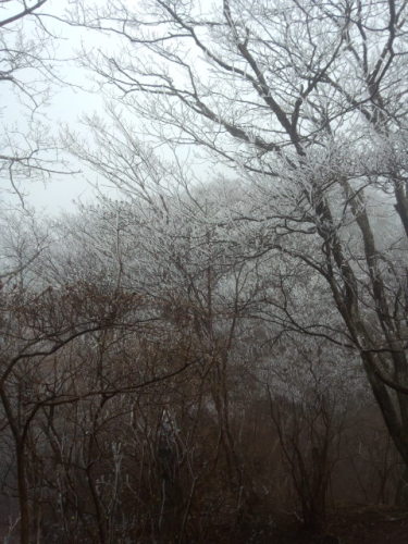 4月20日(日)曇り5:00 起床 昨日の写真をパソコンに取り込む。朝食準備:鶏肉の唐揚げ、野菜炒め(玉ねぎ、人参、シイタケ、シメジ、チンゲン菜、ハーブウィンナー)、アブラナのお浸し今朝はあまり天気が良くないらしい。TVをつけ、のんびりしてしまう。9:28 家発水沢観音の大駐車場は、曇天を払拭するがごとく桜の花と舞い落ちた花びらとで最後の輝きを放っているかのように見えた。上の駐車場に向かう途中のシャクナゲも満開だった。9:38 上の駐車場発 4℃ 77歩黄緑の上着を着た長身の男性が下ってきた。静野さんが下ってきて、「霧氷が綺麗でしたよ。」と教えてくださった。でも、今は4月下旬だ。連日の暖かさを体験していた私には、意味を持たない単語として脳裏をかすめていくだけだった。道端のタチツボスミレの花があちこちで見られる。9:46 登山口青池さんが下ってきた。高崎の5人の団体さんが登ってきたが、今朝は足が軽く、先に登る。9:58 第一休憩場所エイザンスミレ、アケボノスミレの花を楽しみながら登る。低木のコクサギが光沢のある黄緑色を増している。山吹は今にも開きそうな「黄色の蕾をつけていた。須田さんが登山道を直してくださっていた。「今日は遅いじゃない!」と言って隣町の中沢さんが追い越して行った。小菅さんが登ってきたので話ながら一緒に登る。若者が駆け下って行った。お休み石下のイカリソウが白い蕾をつけ、今にも咲きそうだった。10:17 お休み石キブシのクリーム色の花房が大きくなっていた。ご夫妻が下ってきた。岩場付近にフモトスミレが可憐な花をつけていた。岩船からの10人の団体さんが下ってきた。ミツバツチグリであろうか?黄色い蕾をつけていた。ヒナスミレもある。長瀞の2人と地元の案内人?のグループ、グリーン服の男性、宮石さん(今、西上州の山に行かれているそうです。)が下ってきた。広田さんが登ってきた。10:40 一本檜女性3人、吉田さんが下ってきた。「景色いいね!今日は・・・」と言っていた。石仏手前から霧氷が始まった。10:47 石仏山本さん、隣町の中沢さんに会う。尾根はまだ霧氷が残っていた。早朝に登ったら感動する景色が広がっていたのだろうな。こんな時にカメラを忘れてしまったので、携帯で撮る。 霧氷が落ちて地面が白くなっていた。 11:01 水沢山頂着 霧 8℃ 4659歩山頂には反対側から登られた前橋からの団体さん8人が休んでいた。小菅さん、広田さんは先に下る。11:10 山頂発若い男性、若い女性、磯貝ご夫妻、宇都宮からの団体さん6人に会う。霧氷がパラパラと落ちる。11:22 石仏杉本奥さん、神さん似の長身の常連さんが「今日は遅いんですね!」と言って登って行かれた。鉢巻のように巻いた男性、老若の男女2組が登って行った。霧がまき、空気はひんやりとしている。11:41 お休み石広田さんと小菅さんが休んでいたので、また一緒に下る。磯貝ご夫妻、若い女性2人、男女、小板橋さん、6歳の女の子を連れた父子、眼鏡の男性、男女に会う。12:07 登山口親子3人に会う。杉本奥さんも下ってきて話ながら下る。12:15 上の駐車場着 7℃ 9483歩家に着いて、いつものように草むしりと庭の落ち葉、落ち花を片付けをする。赤い花桃はまだ咲いてはいるが、かなり落花し、下は花の絨緞となっている。夕刻、マイ菜園に行き、野菜を採ってくる。(アブラナ、万能ねぎ、ニラ、アシタバ、ネギ坊主)夕食は天ぷらうどんてんぷらの具材(アシタバ、下仁田葱のネギ坊主、ウド、紅はるか)