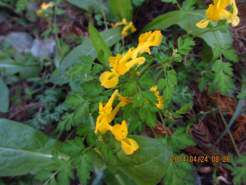 4月24日(木)晴れ去年の4月23日の三ツ岩岳は4月20日の夕刻から降った季節外れの雪でアカヤシオが落ちてしまい、まるで宴の後のようだった。今年も20日に水沢山は霧氷となった。仲間の一人が心配して下見に登ってくださった。満開だとの知らせに今年は期待を膨らませて再挑戦した。アカヤシオは山全体を覆うほど見事だった。あまりのすごさに写真を撮りまくる。ついつい遅れて仲間に迷惑をかけながら・・・今年は去年の逆のコース(竜王大権現コース)を登った。登山口からいきなりの急登。つづら折りの急登を汗を吹き出し、息を切らせながら登る。竜王大権現で休憩する。(9:03~)、尾根の表示(9:18)見事なアカヤシオ、ヒカゲツツジが見え始める。写真を撮りまくる。 尾根コース・竜王大権現コース・三ツ岩分岐(9:38)、三ツ岩岳山頂着 標高1032m(9:46~)記念撮影、尾根コース・竜王大権現コース・三ツ岩分岐(9:56)、昼食(10:47~11:07)、尾根コースを下る。登山口着(11:51)、家着(13:30) キケマン ユリワサビ コガネネコノメソウ エイザンスミレ カテンソウ 竜王大権現の切り立った岩と杉 アカヤシオが、 まさに花咲き山状態です。 ヒカゲツツジ トウゴクミツバツツジ尾根コースで下る。途中で林道に出るが、すぐにピンクのリボンの目印が有る急なつづら折りの登山道を下る。沢にはまだ残雪があった。フタバアオイミチノクエンゴサク(ヤマエンゴサクと言うよりもミチノクエンゴサクのように見える。分布は日本海側とあるので・・・・?)ハナネコノメソウハシリドコロヨゴレネコノメソウのように見えるが・・・・?