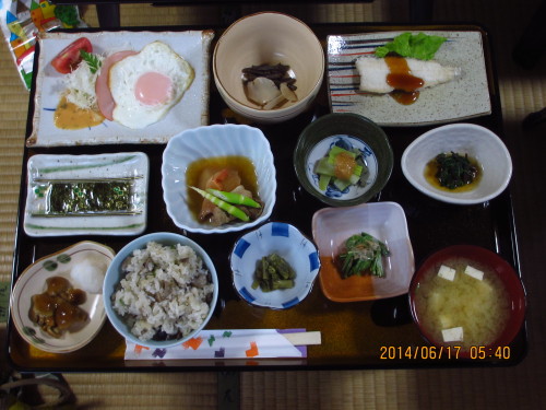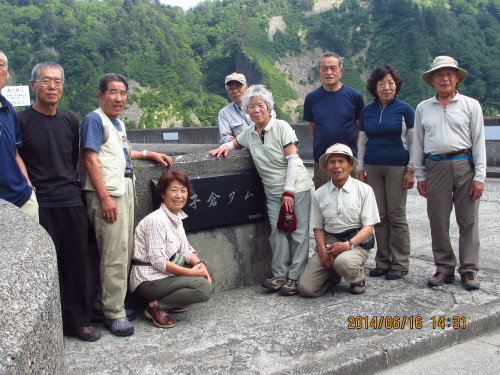 6月16日(月)9:48 子持発・・・11:15小出インター・・・~12:03 深雪の里(94km)・・・国道352・・・12:40 銀山平(131km 通行止めのためにUターン)・・・ 13:00 シルバーライン出口・・・13:18 (信号)今泉・・・国道252・・・14:22~14:33 田子倉ダム(201km)・・・国道289・・・401 ・・・15:50 民宿 星の家着すぐに燧の湯へ・・・1次会・・・18:00~19:04 夕食・・・ダウン昨年10月18日に星の家に泊まって燧ケ岳に登った。山の幸が豊富なお料理やおもてなしが気に入って、泊まった日に「来年もこの民宿に泊まろう!」とほぼ決めた。そして、帝釈山に登ることになった。1日目の目的地は民宿「星の家」である。。高速は水上インターから小出インターまで。1850円道の駅「深雪の里」で昼食をとる。山掛けそばを美味しくいただく。シルバーラインで銀山平まで行ったら、道路にロープが張られていて通行止めになっていた。道路の雪が自然に融けるのを待って開通となるそうだ。シルバーラインの入口の上の方に確かに通行止めと書かれてあったが、分かりにくい。大概の人は見落としてしまうだろう。仕方なく小出まで戻って田子倉ダム経由で桧枝岐村の民宿「星の家」に行くことになった。田子倉ダムで休憩し、記念撮影。思いがけず雄大な景色を眺めることができた。今回は助手席に乗ったので車酔いすることも無く、快適に過ごすことができた。ただナビ役は果たせなかったが・・・星の家に着いてすぐに燧の湯に行く。遠方からこの湯に入ることが目的で来ている人もいるくらいいい温泉だ。寝る前にまた入ることにして、民宿に戻る。一次会が始まった。春菊、山椒の佃煮、青じそのみそ炒め、イカの口、・・・・美味しいおつまみをつまみながら・・・缶ビール1杯を飲んで、コップにもう一杯。次に霧島の炭酸水割、そしてもう一杯。コップに半分以上有ったお酒(後で泡盛と知った。)を炭酸水で割って飲んだ。口当たりがよく美味しくいただいた。ここで1階の夕食会場へ移動する。まずは山葡萄酒で乾杯し、日本酒を戴きながら山菜料理中心の食事を美味しくいただく。お蕎麦も美味しかった。昨年はご飯も美味しくいただいたのですが・・・・今年は飲みすぎたのか食べられない。と思っているうちに目をつむると部屋がぐるぐる回りだした。部屋に戻って同室の方が敷いてくださった布団に倒れこむようにしてすぐに寝てしまった。目が覚めたのは0時18分だった。