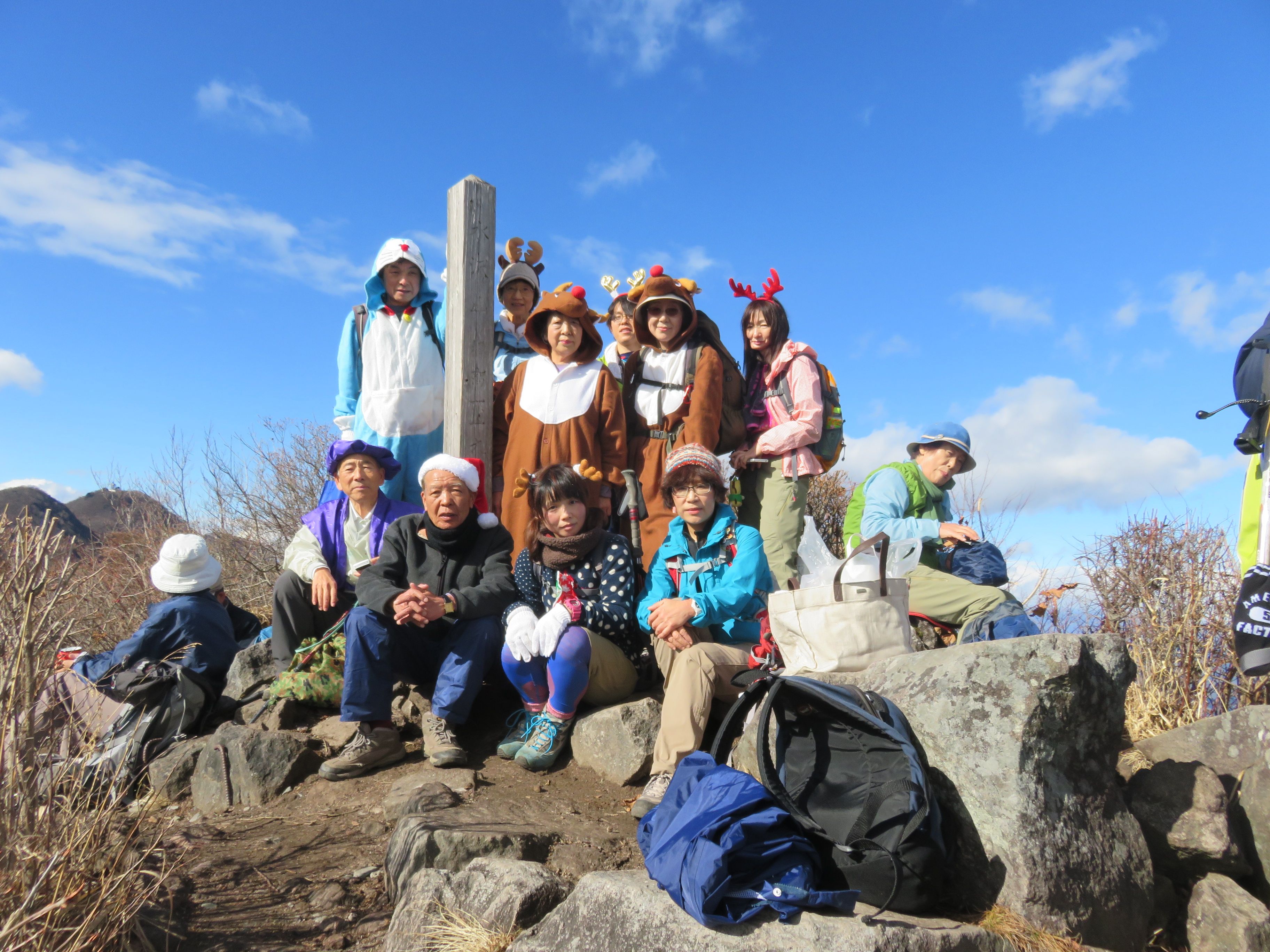 12月23日5:00 起床朝食準備:春菊の胡麻和え、大根葉&竹輪炒め、洋風おでん(昆布、大根、人参、自家製蒟蒻、ゆで卵)、おにぎり10個(若芽、ひじき)9:00 水沢観音大駐車場着今日のサンタイベントに参加する人たちが集まって来た。トナカイ着ぐるみのHIRATAさん、トナカイのNOBUSAWAさん、OBUTIさん、トナカイのKUROIWAさん、トナカイのHORIKOSI みゆきさん、サンタ帽子のTAKEUTIさん、トナカイのANDOUさん、古希いでたちのKOBUNAさん、SIBASAKIさん、ドラエモンのISOGAIさんとトナカイの奥さんとトナカイの娘婿さん、甲冑を着けたTAKESIGEさんとトナカイ着ぐるみの私 計14名9:30 水沢観音大駐車場発住職さんのお墓にお参りしてから登り始める。男性2人、MURAKAMIさん、SAMATAさん、HASEGAWAさんに会う。9:51 登山口MATIDAさん、HOSOKAWAさん、ZIN奥さん、TAKANO奥さん、MIYADERA奥さん、SIZUNOさん、ZINさん、NUMAZAWAさん、ISIZEKIさん、MIYADERAさん、男性3人、女性4人が下って来た。膝故障中のサンタさん、HORIKOSIさん、ANDOUさんたちは、ベンチのベースキャンプでプレゼンントを渡し、他の人たちは山頂まで登る。KOSAKAさん、ロッククライミングのNAGAOさん、男性3人が登って行った。10:33〜10:39 お休み石風も無く、暖かなので着ぐるみを着ていると汗だくになる。男性12人、女性2人、SUGIMOTO奥さん、男の子、古賀志山に登られているHUNAKIさんが下って来た。男の子と男の子を連れた女性が登って行った。11:10 石仏男性5人、女性5人が下って行き、男性3人が登って行った。石座には新潟の南魚沼からいらした男性5人が休んでいた。11:26〜11:46 水沢山頂着 晴れ 9℃ 狭い山頂には20人程で賑やかになった。暮とは思えないほどの暖かさだった。記念撮影をし、おにぎりをいただく。美味しかった!下り始めて、何処かで会った人・・・よーく見たらHUKUDA MIYOKOさんだった。この山ではすーっと前、水沢山頂でお会いして以来です。お久しぶりでした。写真、お楽しみにしていてください。女性が登って行った。11:57 石仏男性、男女、隣町のNAKAZAWAさんに会う。12:16 お休み石男性と女性が私たちを待っていてくださった。有りがたいです。男性、女性3人に会う。12:24〜12:52 ベンチ上毛新聞社の方が取材にいらしていた。写真を撮ってから甘酒やらコーヒーやらを戴く。ベースキャンプも交流の場所となり、いいものですね。それにしても、テーブルやら、甘酒やら、コーヒーやら何から何まで用意してくださいましてありがとうございます。それから、古賀志山のSIOZAWAさん、水沢山のネームプレートを沢山作ってくださいましてありがとうございました。水沢山登山のよい記念になります。KURIYAMAさん、AMANOさん、バッタを沢山作ってくださいましてありがとうございます。1つ作るのにも結構時間がかかるとお聞きしています。本当に古賀志山の皆さん、ありがとうございました。それから、今日参加してくださいました皆さん、大変お世話になりました。ありがとうございました。今日は水沢山に登られた皆さんや、参加していただいた皆さん、差し入れをしてくださった方々、プレゼントを用意してくださった方々、ありがとうございました。皆さんから戴いた笑顔で心が温まりました。そして、沢山のパワーを戴きました。本当にありがとうございました。感謝 感謝です!買い出しを済ませてから、ゆっくり風呂に浸かる。暖かかったとは言え、汗を沢山掻いたので、よく温まりました。初日のイベントが済み、至福のひと時でした。夕刻から来客あり。話が弾み、パワーも戴きました。来年も山を頑張ろう!0:30 就寝
