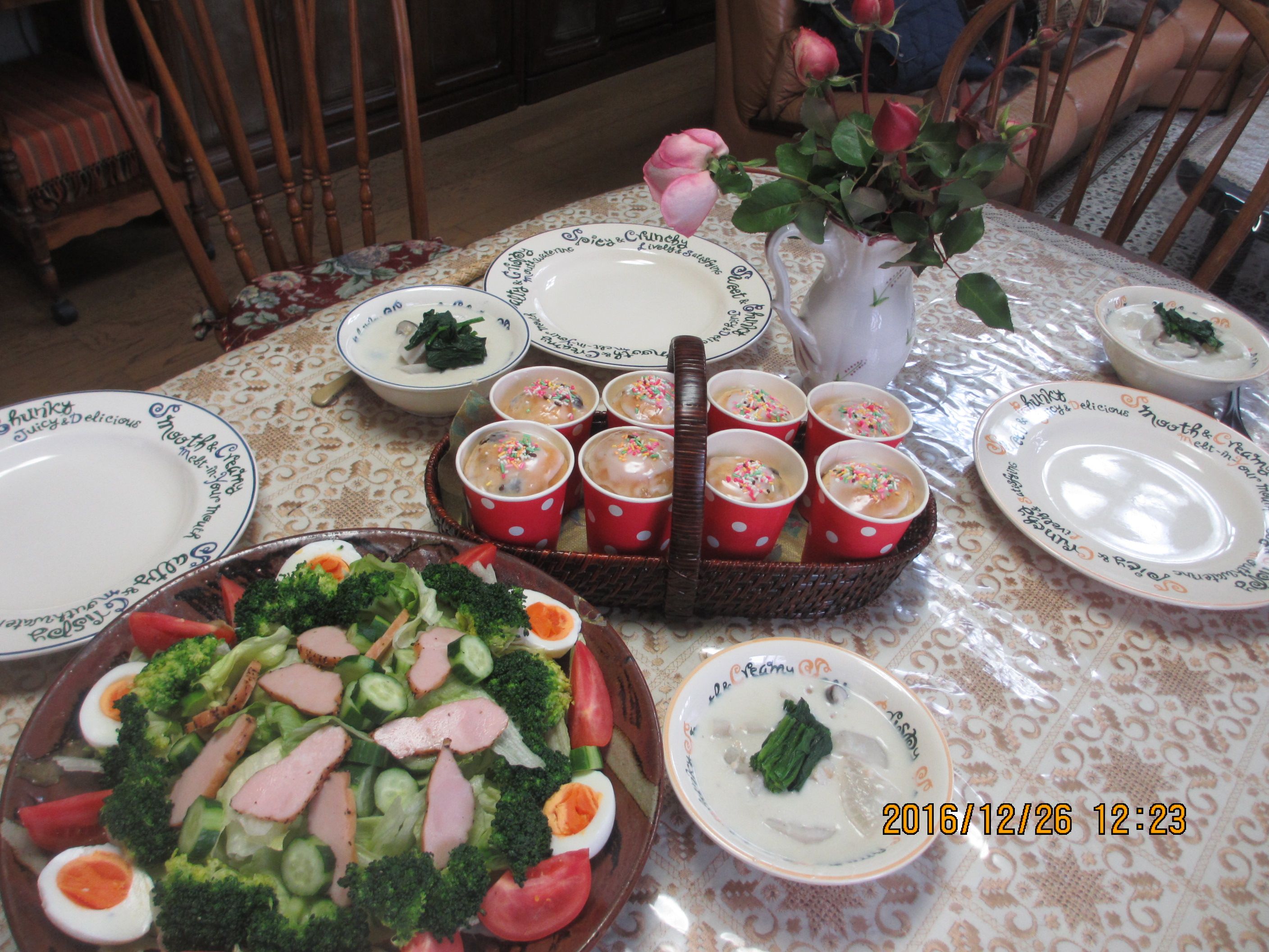 12月26日(月)2:00 起床昨日のクリスマス会の写真をハードデスクに取り込む。クリスマスイベント2日目の写真も24日にハードデスクに取り込んだのですが、半分ほどしか取り込まれていない。元は削除してしまった!さあ、大変だ!今、復元作業にチャレンジしているが・・・スキャン中、時間が有るので味噌饅頭を10個作る。10:00〜パン教室今回の参加者はT、K、O、Sの4名カップ入りブレッドを作った。ドライフルーツが沢山入っていて、アイシングしてカラースプレッドで飾ったもの。焼きたては最高です。里芋・レンコン・大根・シイタケ・鶏肉:ホウレン草のクリーム煮も珍しく、美味しかったです。里芋を使ったレシピがまた一つ増えました。ケーキ15:30〜リウマチ外来夕刻〜次女宅の手伝い
