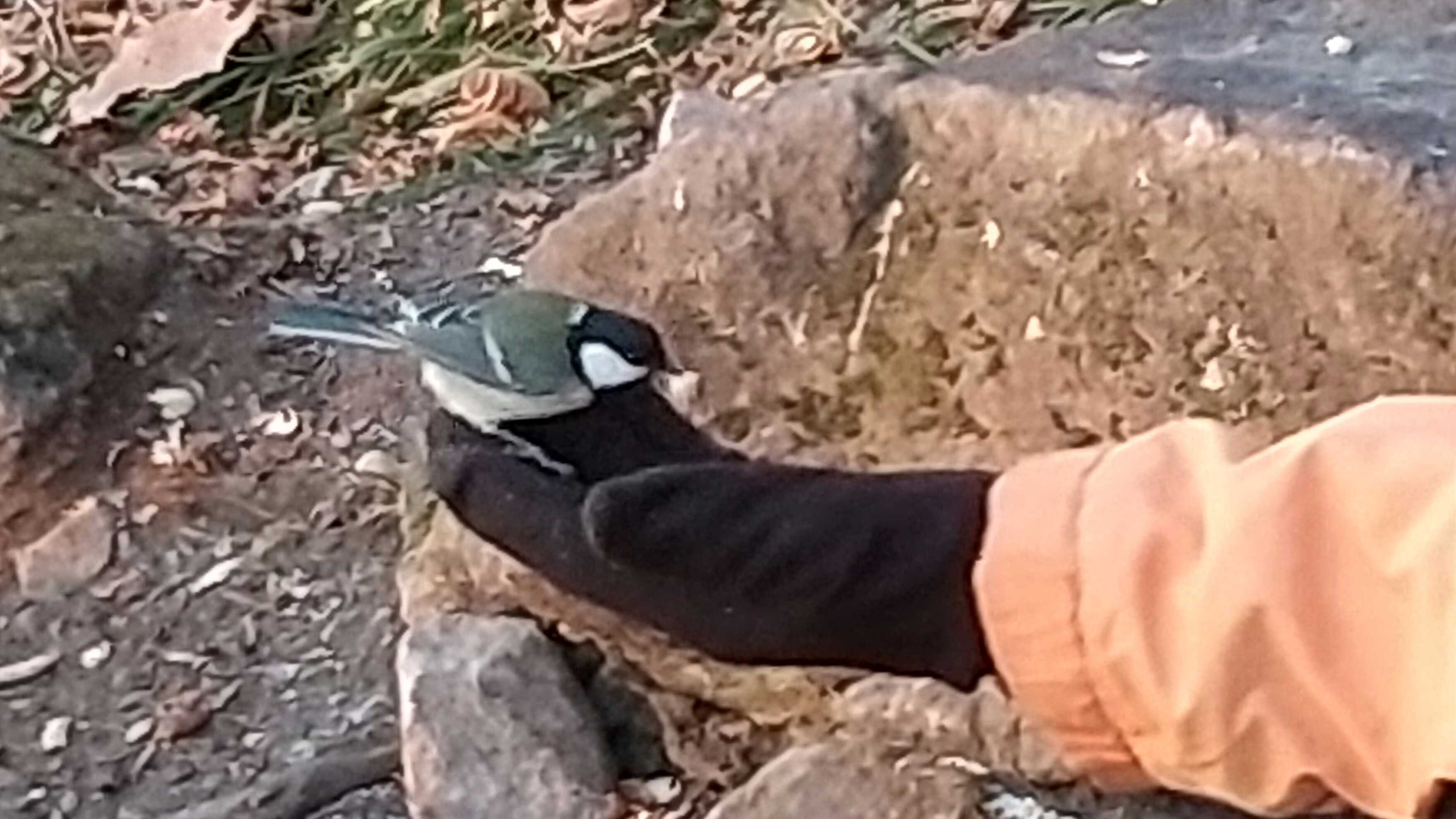 先に登ったGOTさんが口笛を吹きながら小鳥たちに餌やりしていた。