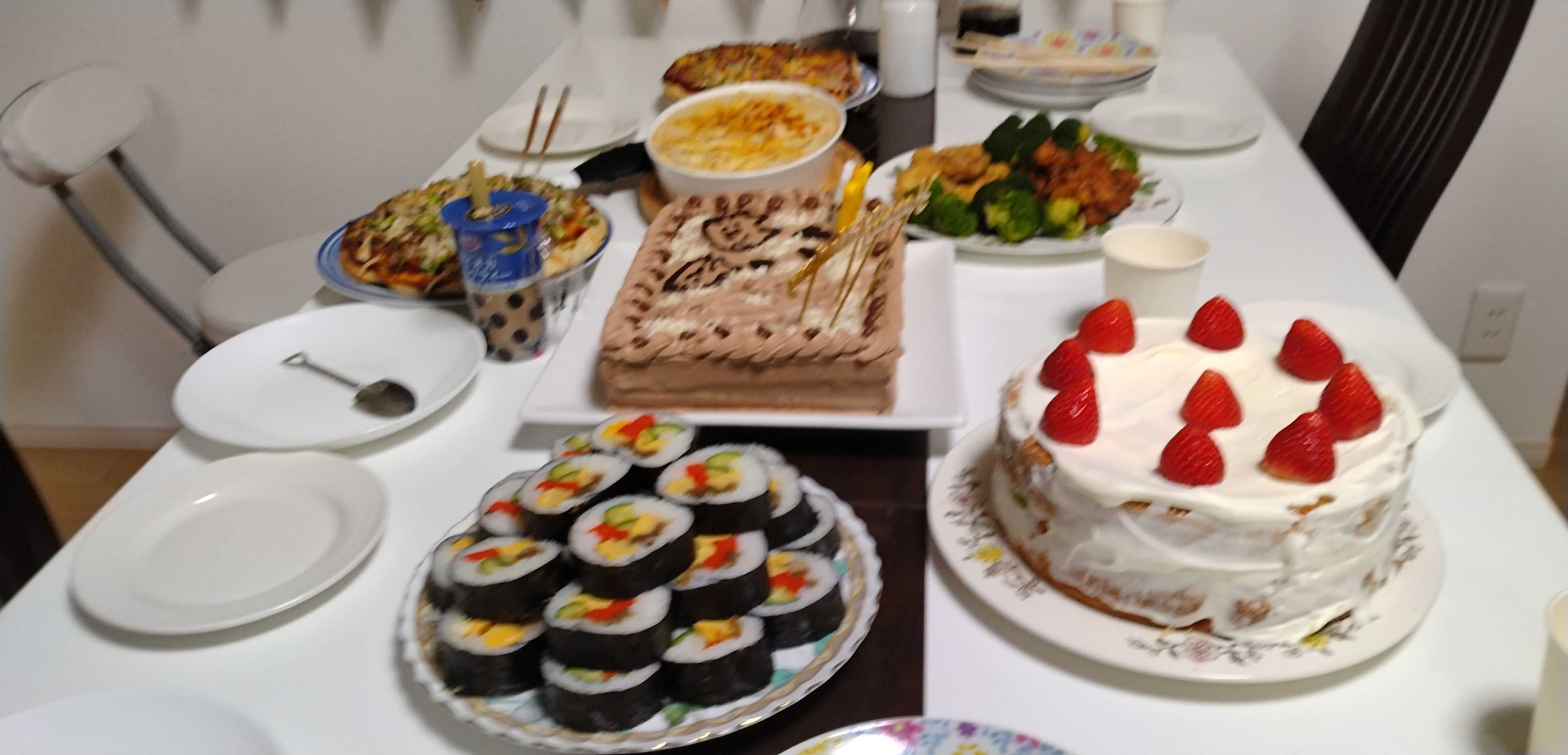 デコレーションケーキ(苺、キューイフルーツ、パイナップル)、ヒレカツ(グルテンフリー)、鶏肉の唐揚げ、カットパイナップル、茹でブロッコリ、太巻き寿司を作る。