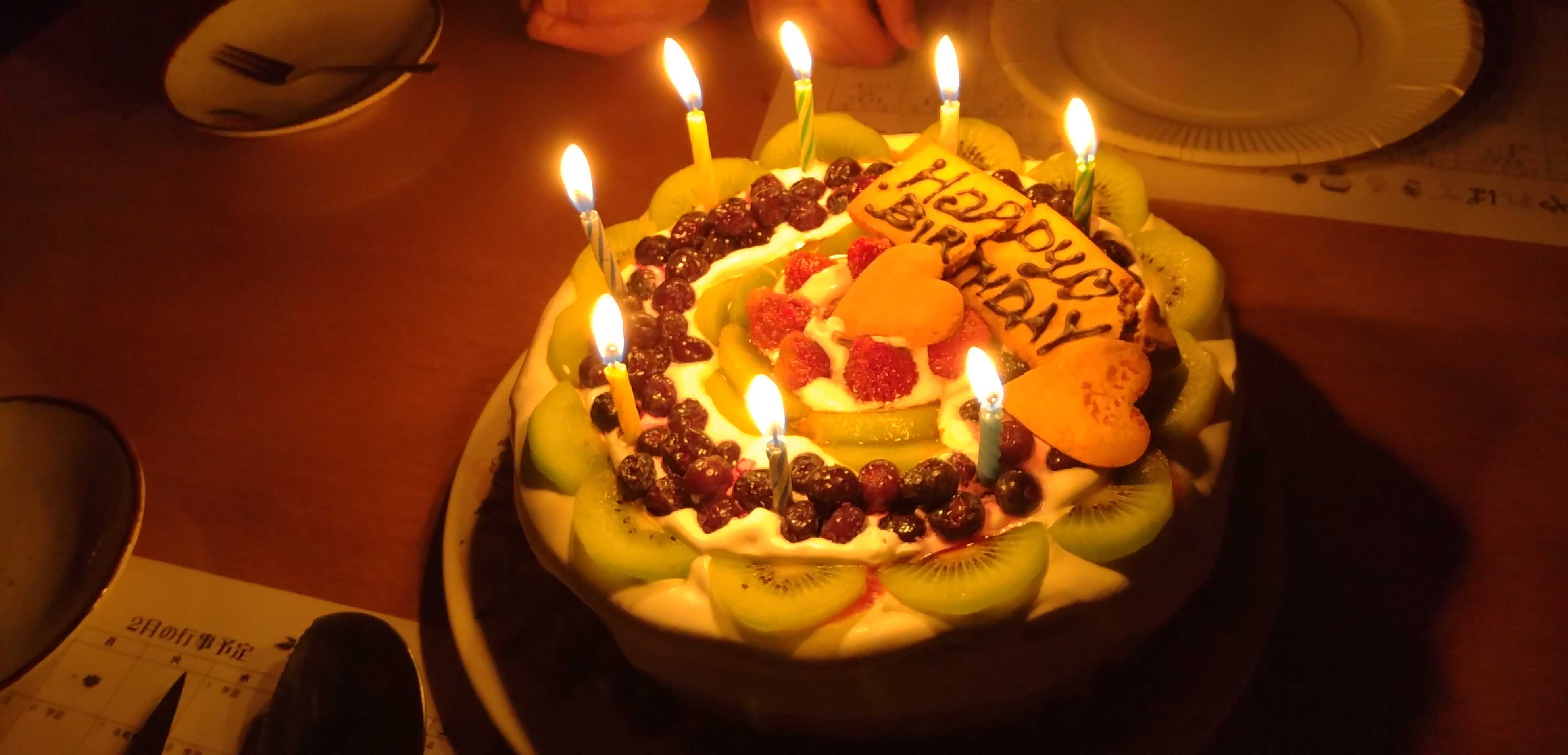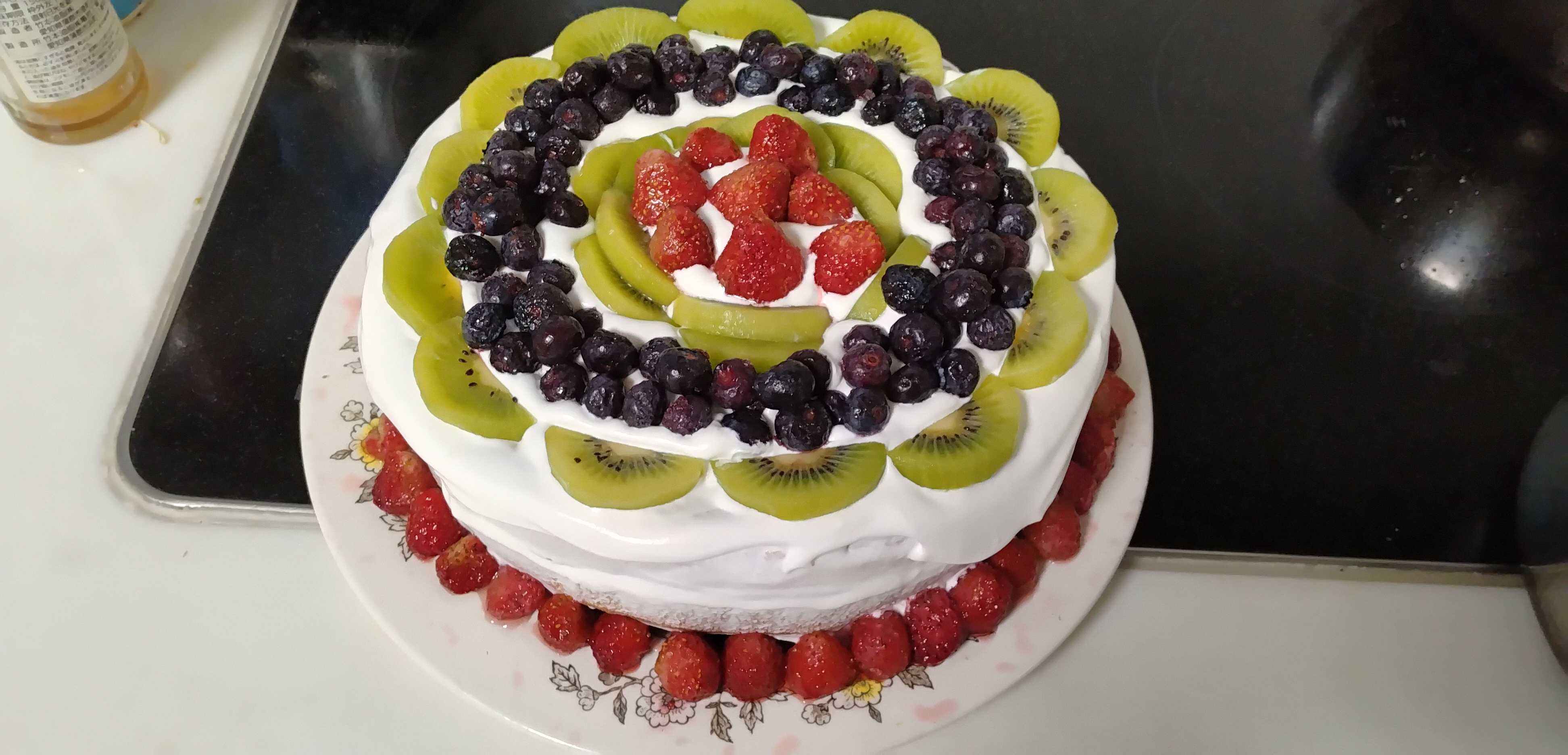 キッチンに入り、おから、茹でブロッコリ、鶏肉の唐揚げを作り、誕生日のケーキをデコレーションする。豆乳ホイップクリーム、キュウイフルーツ、冷凍苺。冷凍ブルーベリーで・・・