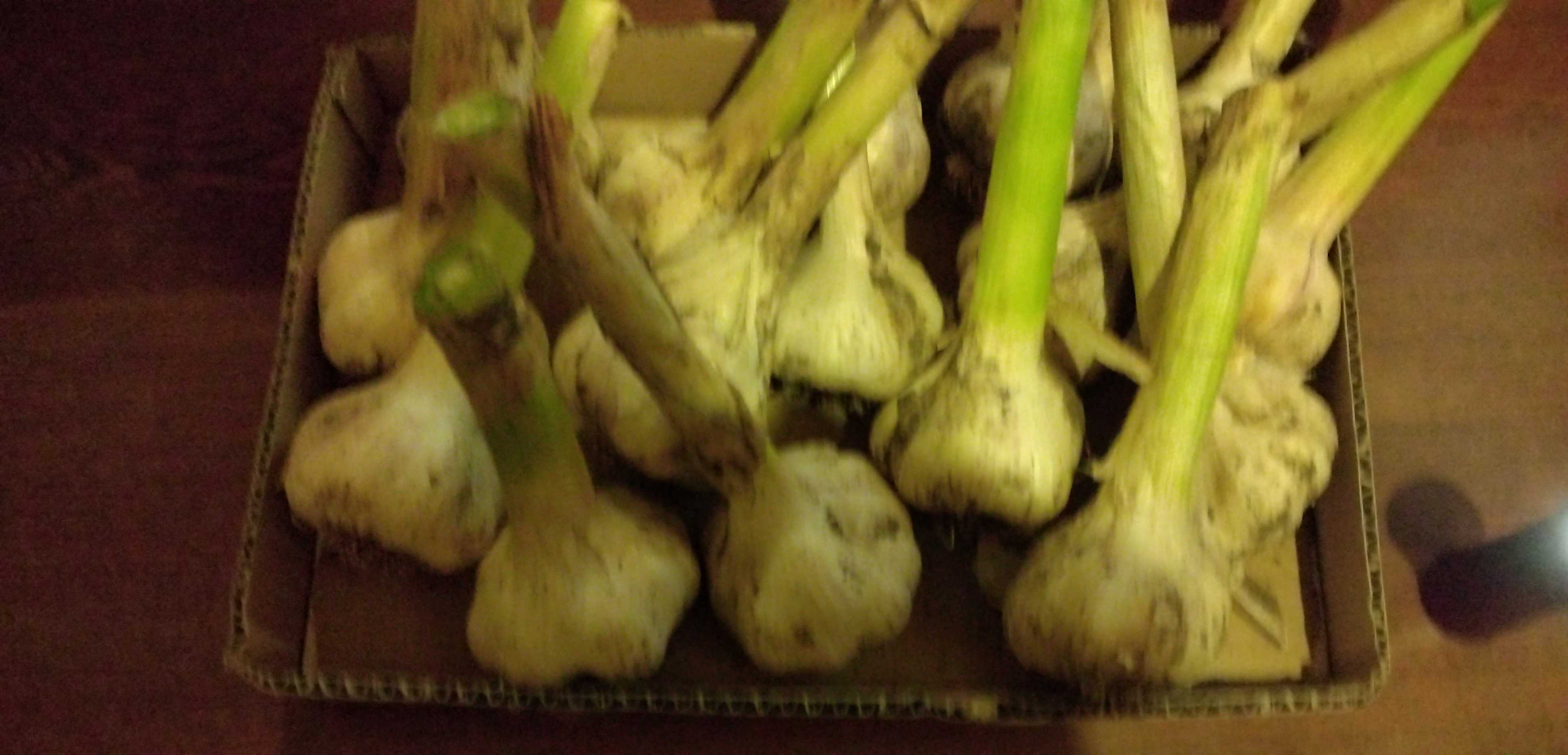 ニンニクを半分程収穫する。15本大きなのが収穫できた。3本は小さ目で、根が伸びていなかった。