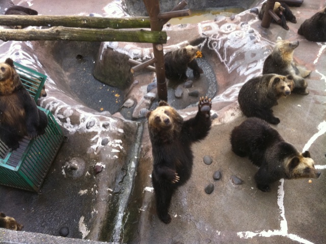 夏休み(?)をもらって、北海道をぶらぶら旅行中ー。一番楽しかったのは、登別温泉のくま牧場でした。だって、クマが手を振ってあいさつしてくれるんやから、びっくりでした。50匹のクマはそれぞれ個性的で、とても癒されました。クマの集団生活も人間たちと同様大変そうです。