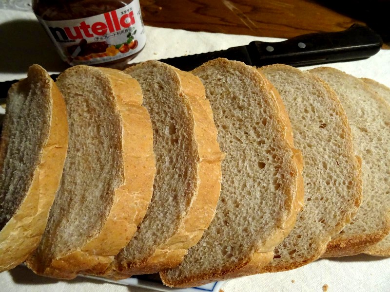 T-fal くん 私の酷使にもめげず、元気で働いてくれてます。たまには オーブンでとは思うのですが・・・彼に出会ってからは、彼ばかり・・・ とても ラブリー いつもは、オリジナルですが、今日は 真面目にレシピ通りに作ってみました。但し、バター→オリーブオイル に。 一部の粉を 全粒粉に。一斤、薄色、メニュー1 ソフト食パン今回は 春よ恋100%が手に入りました。小麦の風味がブレンドよりも良いような気がします。 全粒粉は賞味期限が短いので 早く使わないと! 今回は 本当にシンプル、でも、美味しくできました T-fal くんお任せ! それから、フランスでは大容量で、お安くって、すっごく美味しい ヌテラ ですが、日本では見当たらないので、オーストラリアのヌテラ です。フランスのほうが、ずっとずっと美味しいのは 何故かしら・・・? 素朴なパンですが、便利ですね。サンドイッチ、チーズトースト、色々・・・大好きです