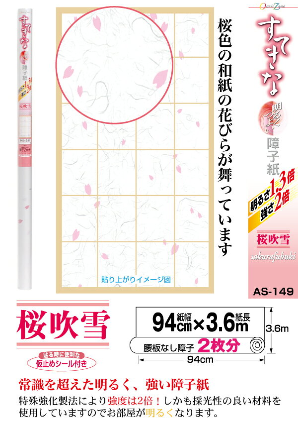 強さ2倍★明るさ1.3倍!『すてきな障子紙 AS-149 桜吹雪 94cmx3.6m ¥910』桜色の和紙の花びらが舞っています!◆のりを使って貼るタイプ!【障子】【価格】【のり】【強い】【明るい】【おしゃれ】【和紙】【貼り替え】【日用品】【DIY】