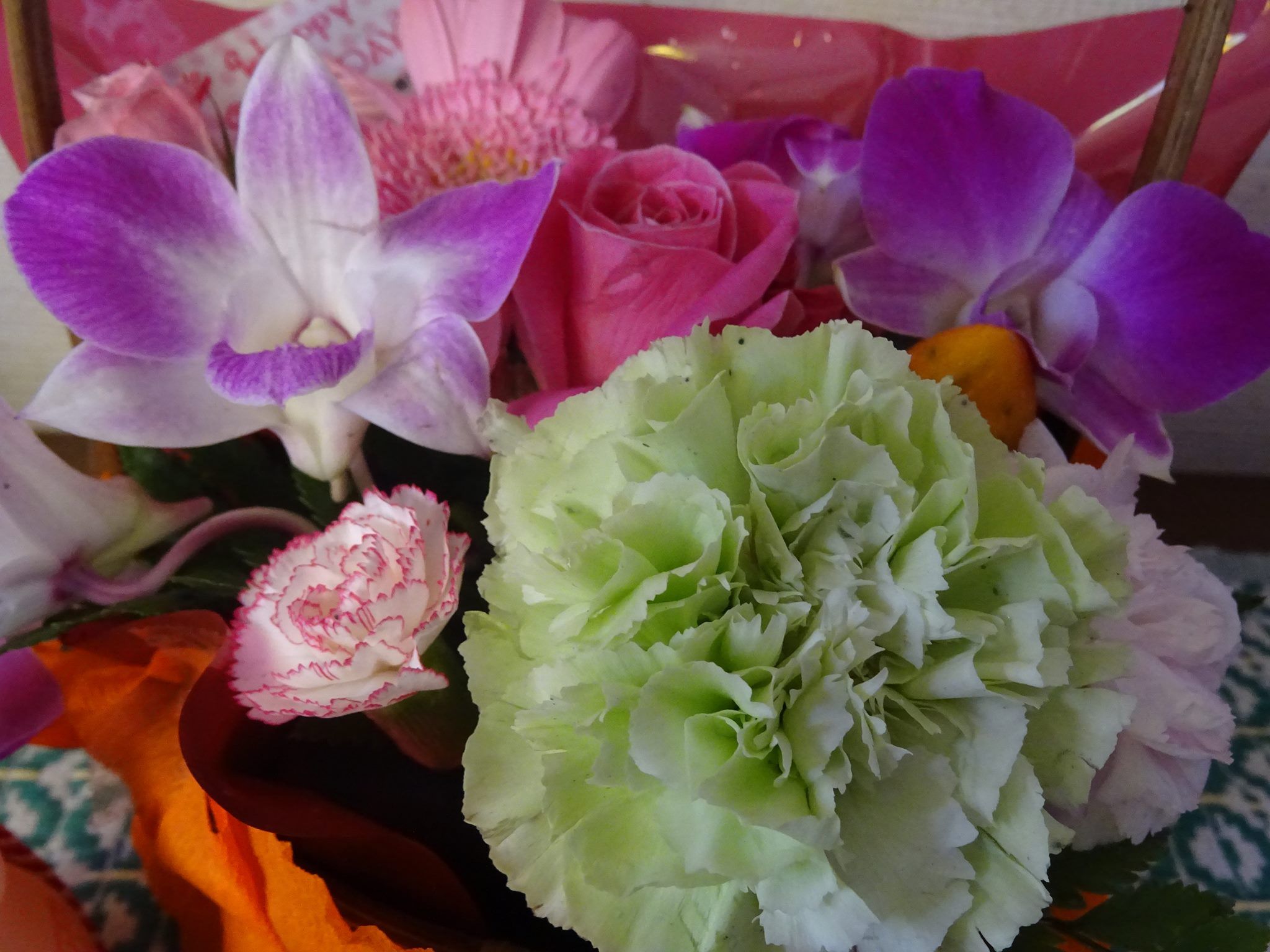 お誕生日に頂いた花籠のリサイクル 庭の花。Fさんからのプレゼント、可愛すぎて食べれなかったクッキー(ビジュアル系)ピックが可愛い今からいただきます!何歳ですねんイノシシ君、また 柿を、むいてます。今度は 特大! 孫バージョンだと