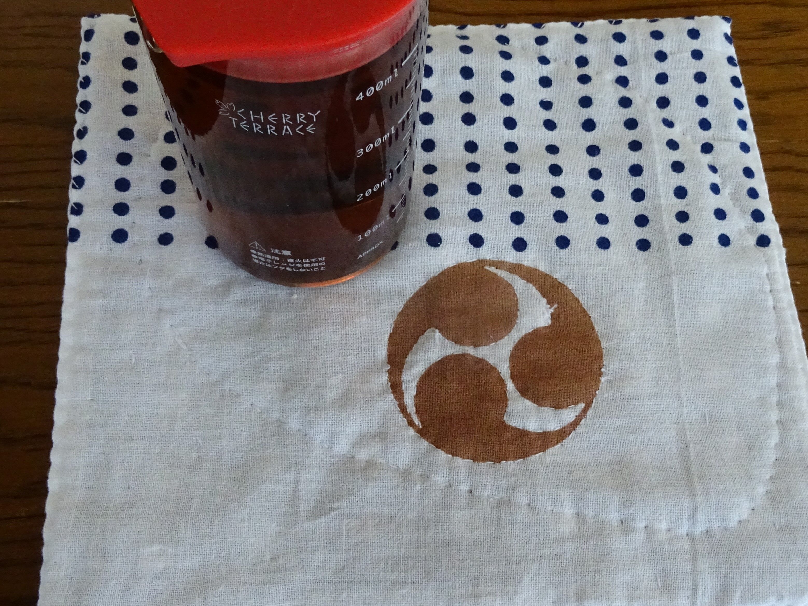 ランチョンマットは 和製英語place mat は 浸透してないですが・・・先日作った布の余りで 小さめです。裏は娘の ボロボロの Tシャツ。ぼろ布にとっておいたのですが、使えるんじゃないか? と。 こちらは、汚れても良い 醤油など。結構、気に入りました