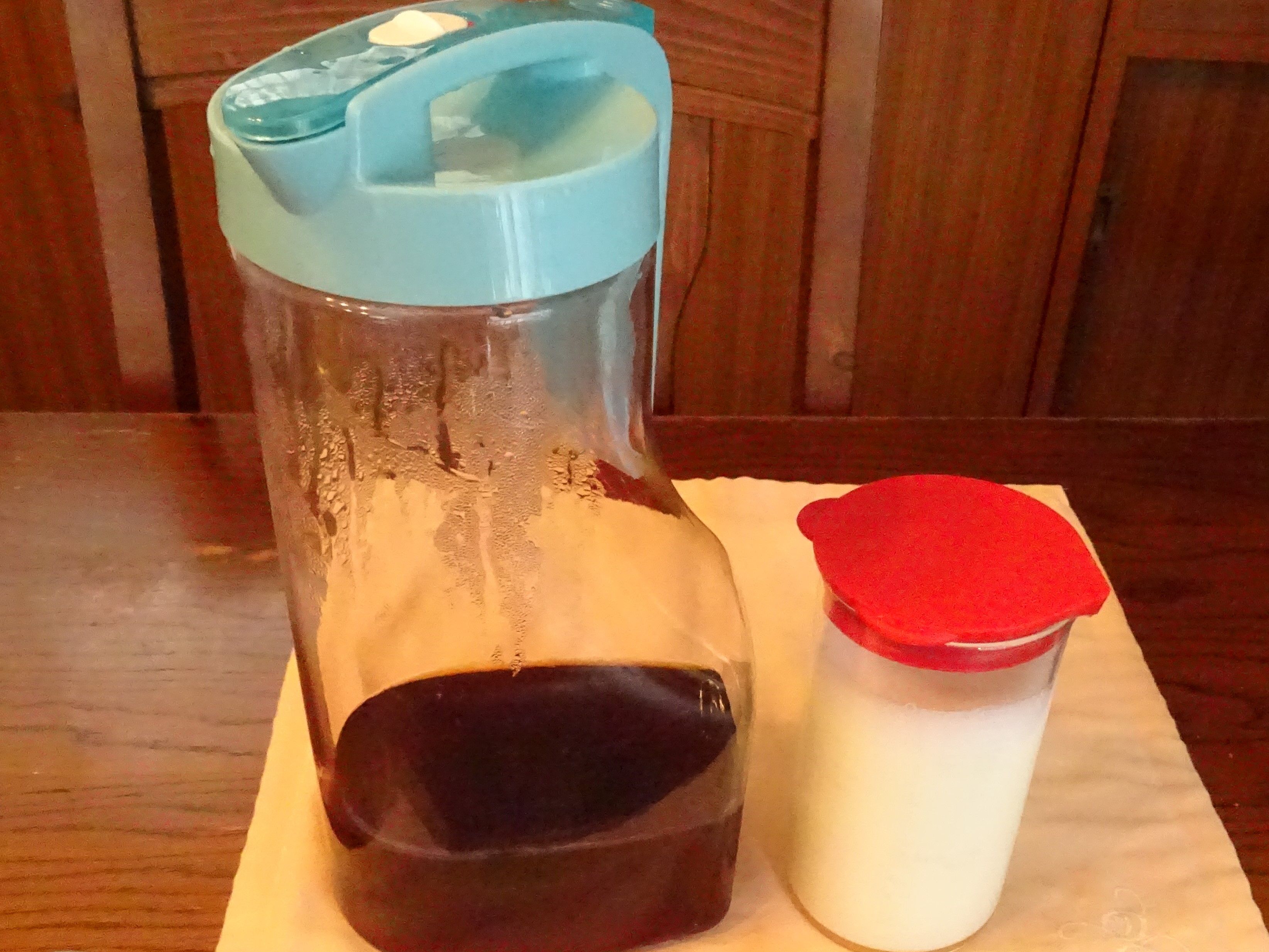 こんな使い方もある!ということで。左 かなり 難あり娘から回ってきました。冷水や麦茶をいれるには蓋が硬くて難儀するわ~。ストレスは 半端ないですフォルムが綺麗なので、捨てるわけにもいかず、いろいろに使ってみましたが・・・ところが、今の時期、多量の冷コーヒーのピッチャー代わりに 都合よい。ということで、これでコーヒーをいれてます。今では 本当 便利、愛用中。適材適所!なんちゃって右は いつものミルク今日の 一日分は 400ccに スキムミルク40cc色々と つかえます。 オオタカ