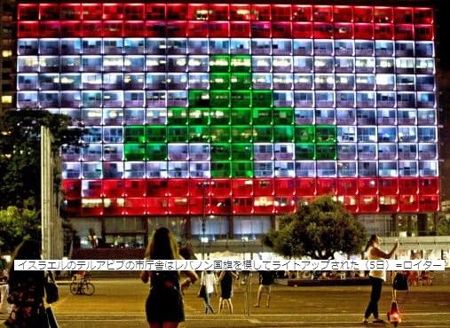 隣国 イスラエルのテルアビブでは 連帯を示すため、市庁舎がレバノン国旗を模してライトアップされた。両国は敵対関係にあり、 極めて珍しい 。(以下略)