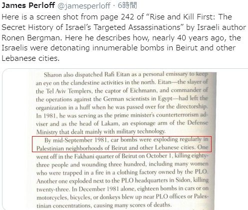 爆撃は、1982年の侵攻前後に諜報員によって組織された同様の爆撃を思い起こさせます。ローネン・バーグマンのモサド暗殺に関する本やレミー・ブルーリンは、この時期にイスラエルによる複数の爆撃が行われ、市民の死と破壊をもたらしたことを記録しています。(中略)
