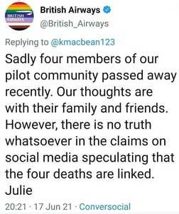 ブリティッシュ・エアウェイズ では、 今週、少なくとも4人のパイロットが死亡しましたが、航空会社は、彼らの死は全く無関係であることを知らせようとしています。