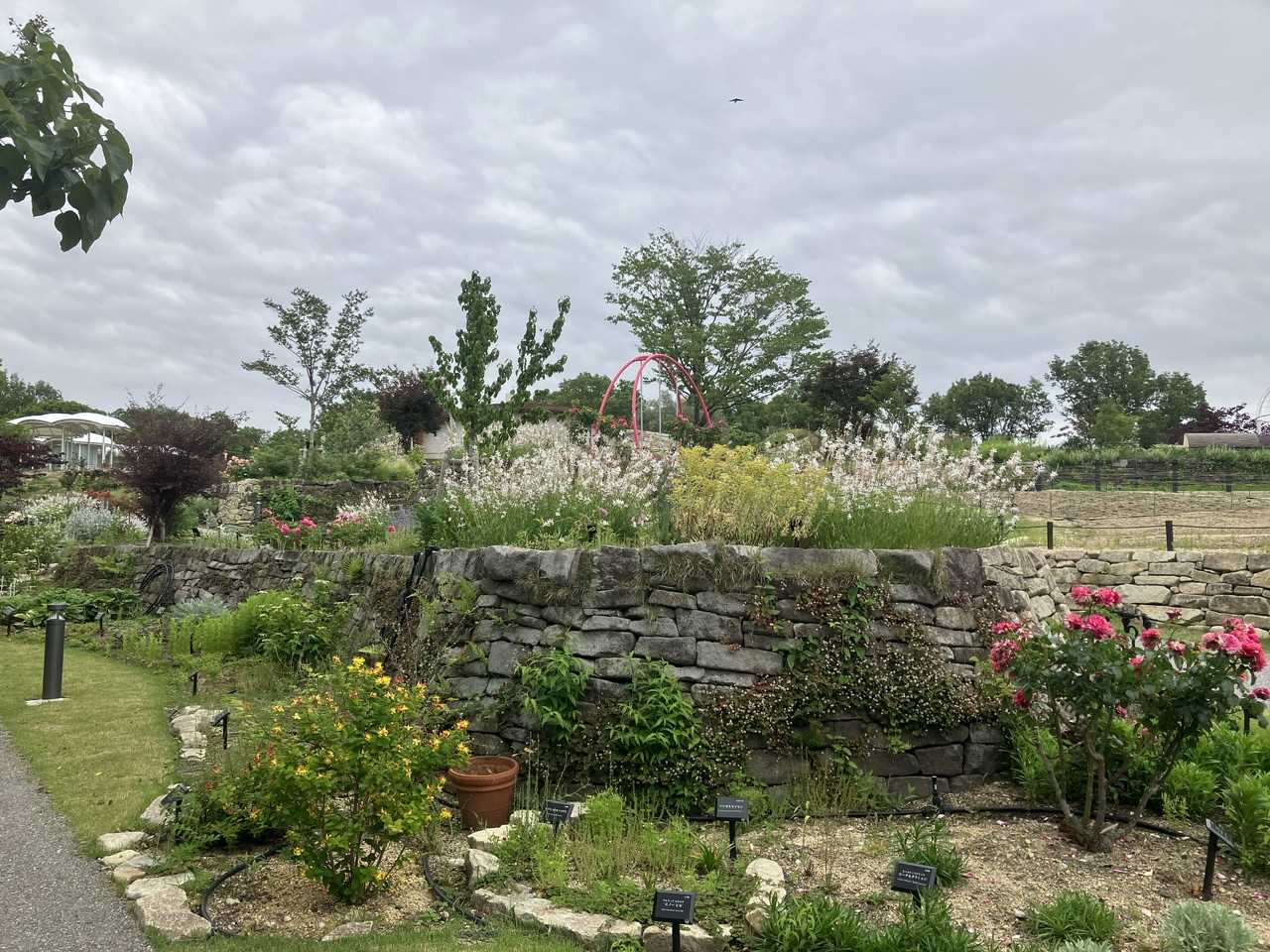 5/下のお花畑おぉ…ゴージャスなバラはきれいだね〜あっもふもふ毛虫!君は触れる毛虫か?ちょっと待ってスマホで検索するから毛虫エアプだから…あ〜まってまって毛虫って以外と足速いよねギボウシ食べられる子なのかな…またね〜(?)もう夏だねアーモンドの実かな?アーモンドの木って意外と珍しくない?