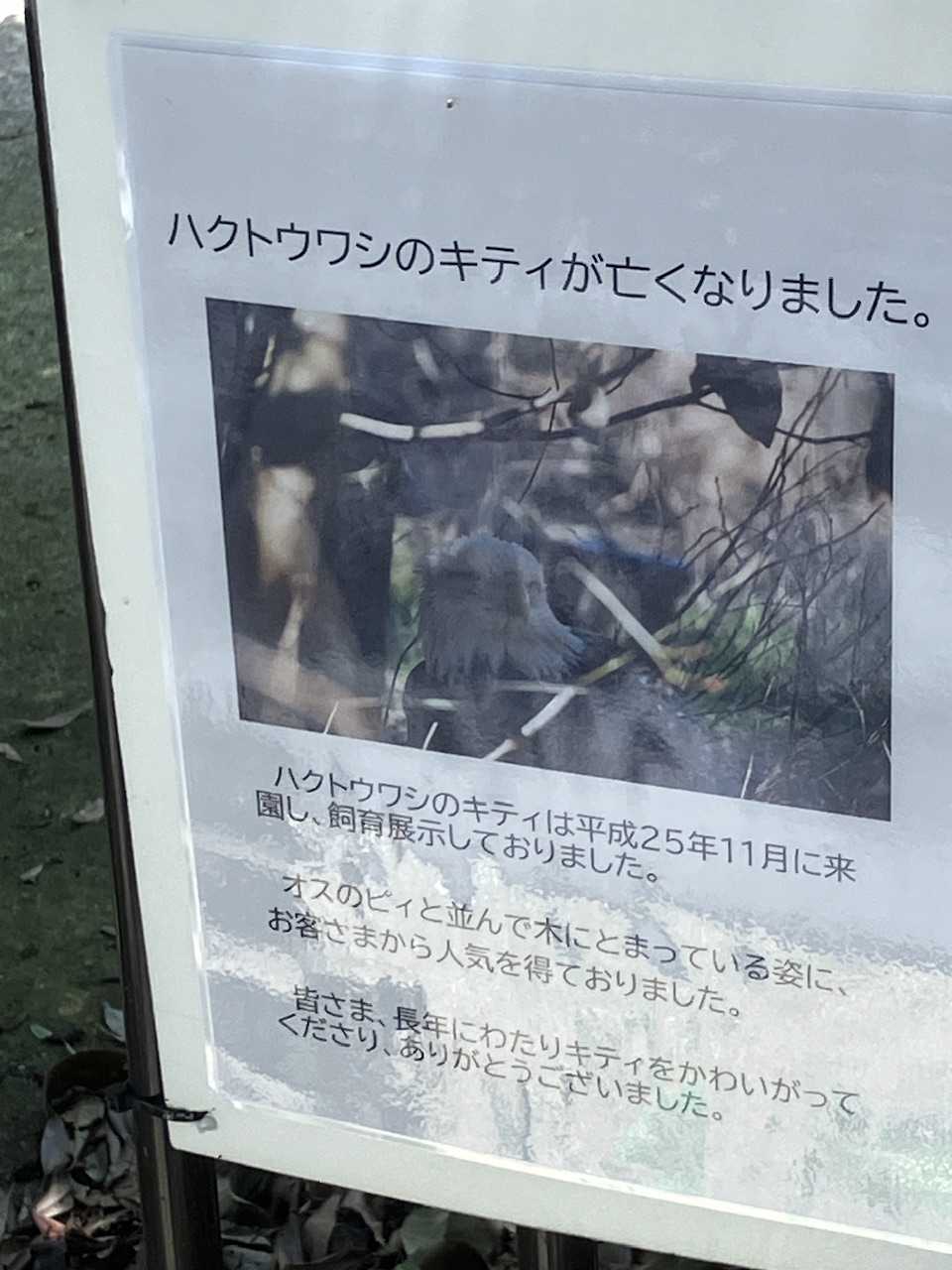 キティさんキティさん、割と(?)最近まで抱卵してたし元気だと思ってた…おしらせないな…?と思ったら裏側にあったわ…キティさんいままでありがとうサンちゃんが来園してます!よろしくね。