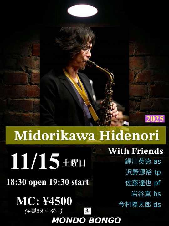 2025年11月15日 sat open 18:30 start 19:30 Midorikawa Hidenori With Friends 緑 川 英 徳 as 沢 野 源 裕 tp 佐 藤 達 也 p
