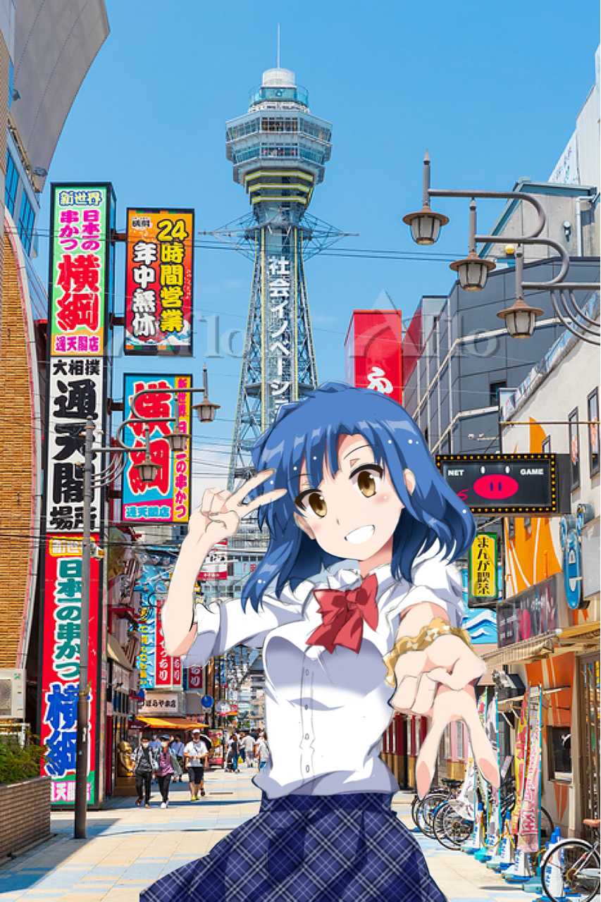 今回のモデルは新世界の女子高生 右手は2代目と同じ敬礼ピースで左手が突き出しピースの「複合ダブルピース」よ さわやかで元気っぽくていい感じっ!