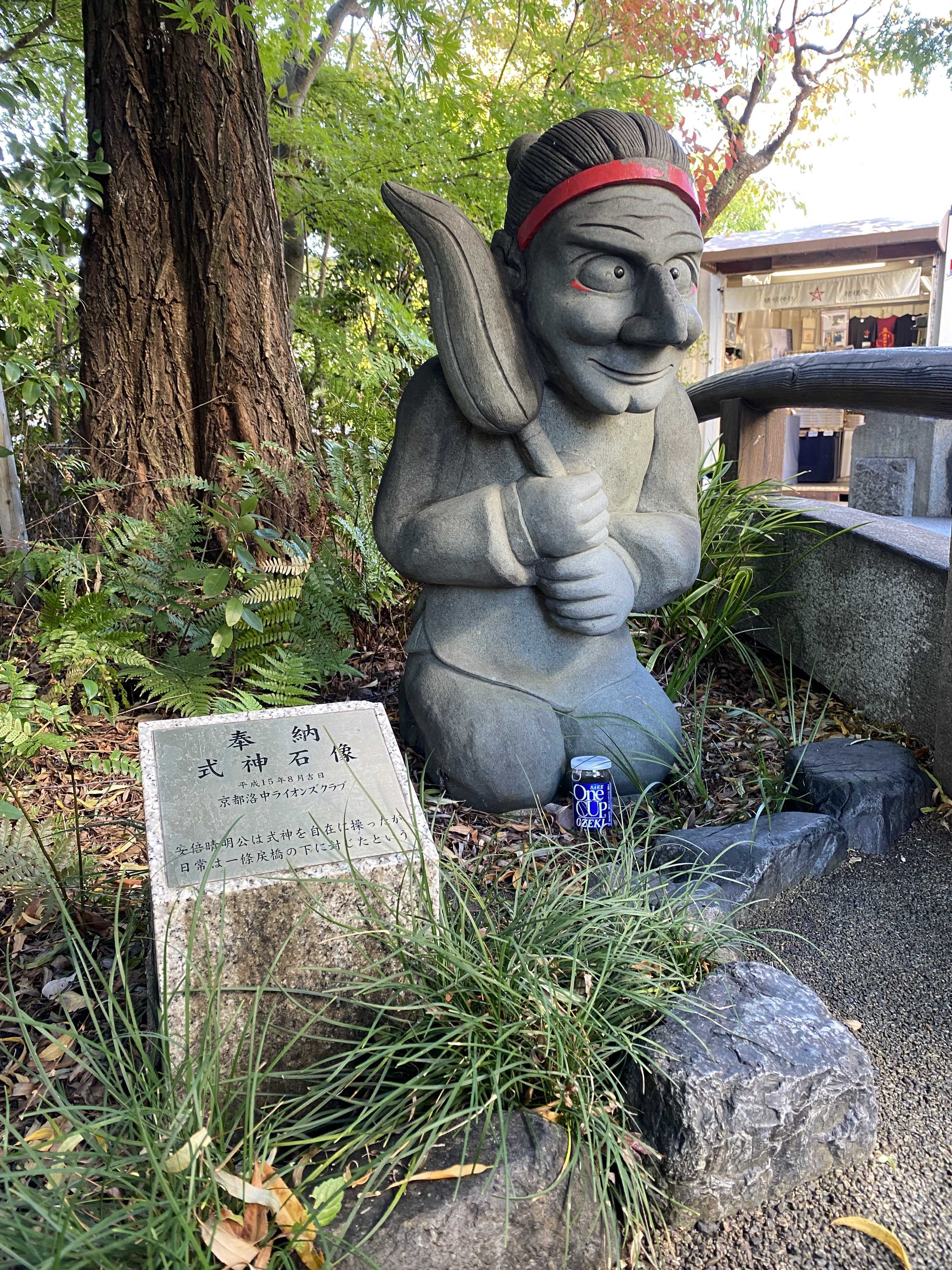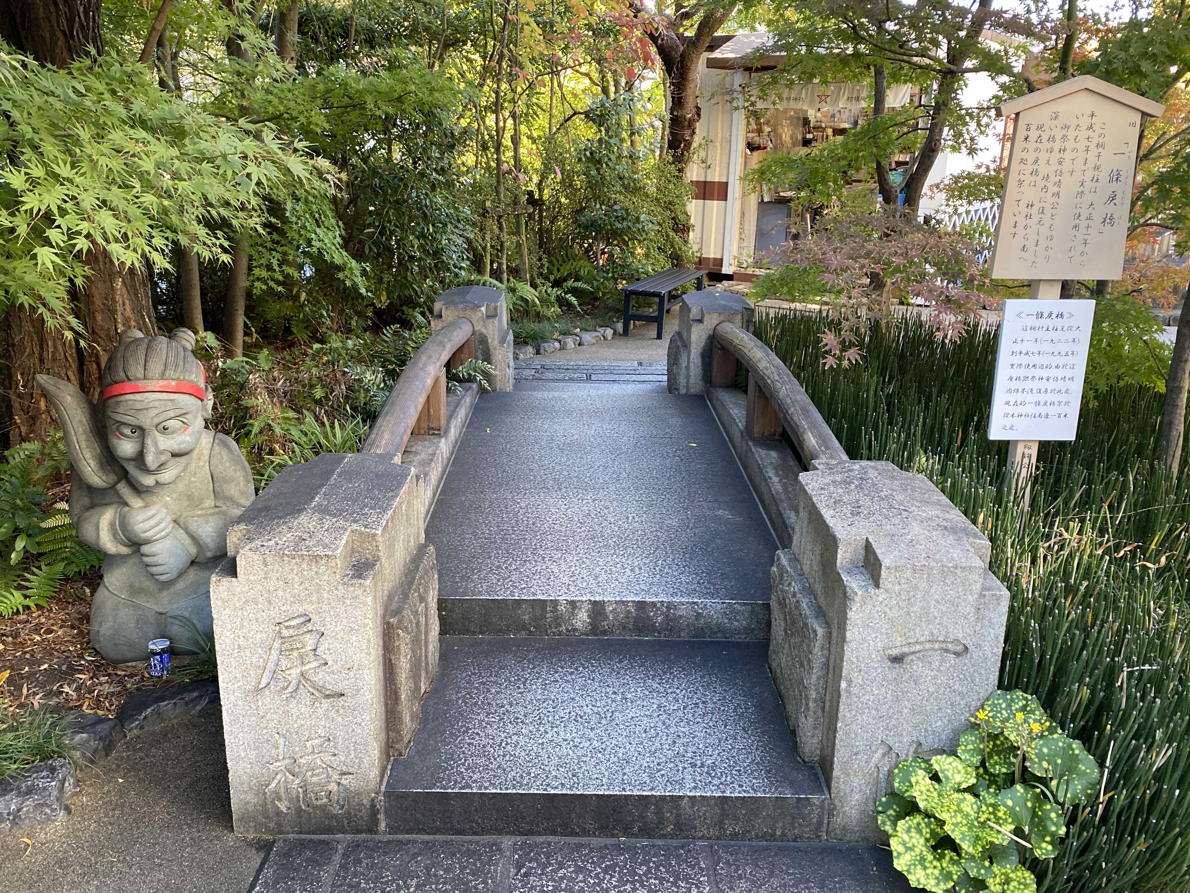 二の鳥居をくぐって境内に入ると すぐ左手に「一条戻橋」と「式神の像」があるよ