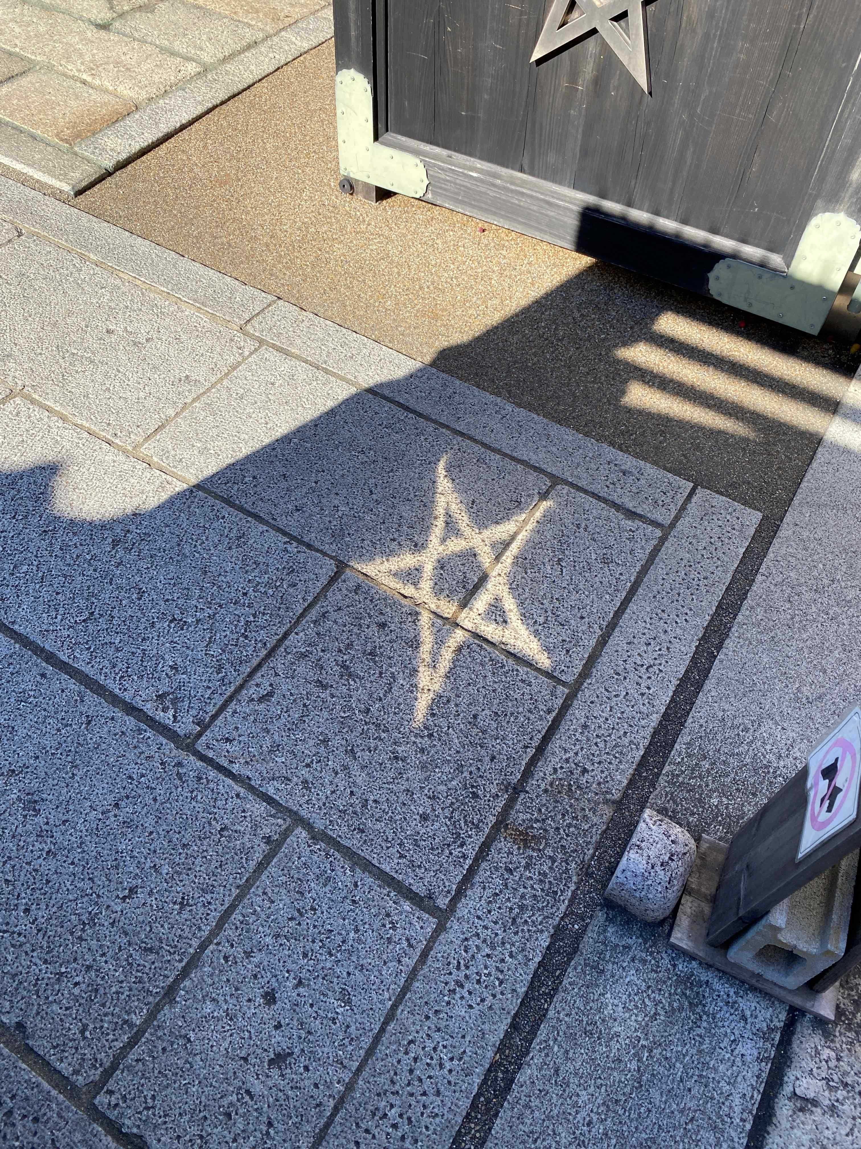 おわっ! 五芒星が石畳に! 突然足元に見えて最初は「ナニコレ!」って神秘的におもえたんだけど 単に扉のプレートが反射して映ってるだけって・・・からくりがわかって「なあんだ そうなんだ」と・・・