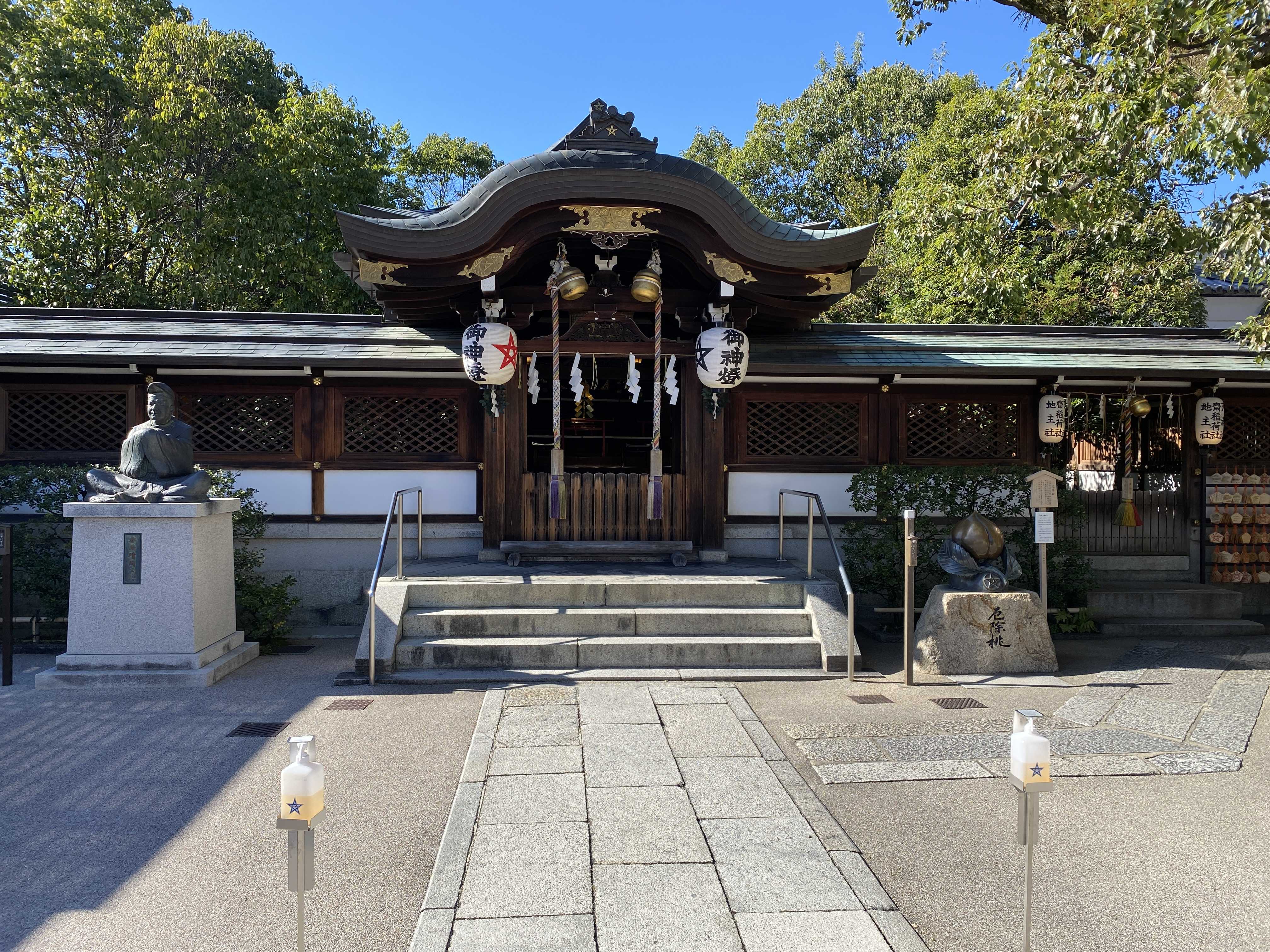 では 突き当り正面一番奥が御本殿です 向かって左側に晴明公の像 右側に桃の石像が置かれています