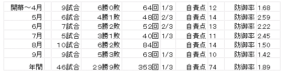 特にリーグ優勝に果たした働きは、まさに「大黒柱」と呼ぶにふさわしい。バッキーがいなければ、絶対に優勝は有り得なかっただろう。次の月別成績を見れば一目瞭然だ。
