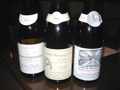 今日も公休日。気の合うメンバーと飲み会でした。今日はお手頃ワインでの飲み会でした。ワインは・ミレジム [2000] アルフレッド・トリタン・ピュリニ・モンラッシェ シャンガン [2005]ステファン・マロスラヴァック・トレモー・ボジョレ・ヌーヴォー ヴィエーユ・ヴィーニュ[2007]ルー・デュモン・シャトーヌフ・デュ・パプ[1977]ドメーヌ・デュ・オ・デ・テール・ブランシュ(ローヌ赤)・Morey-St Denis La Riotte [1996] Henri Perrot Minot・エラスリス ソーヴィニヨン・ブラン レイト・ハーベスト 2004年 375ml[2004]ピュリニはこないだ飲んで間違いないので選択しました。天地人は今年も上出来でみんな絶賛していました。私もお気に入りで何杯も飲んで速攻に空になりました。ペロ・ミノはブラインドで出されました。到着したてだそうです。どうもワインが落ち着いていなく、舌にピリっと刺激がある。96で、とブラインドでしたが、かなり熟成がすすんだ香です。時おりホコリもある。醤油香などしてニュイではなくボーヌをイメージしました。 時間経過でフィネスに隠れていたタンニンの荒さが出てきて、ヴォルネかシャサーニュ赤を連想しました。解答でペロ・ミノと知り、かなり衝撃でした。96のペロ・ミノは弱いのでしょうか??77パブはここちい古酒でした。枯れきってはいません。きれいな古酒で意外と旨い。今日はデザートワインまであって楽しく安価なワイン会でした。