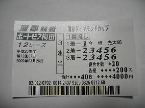 公休日です。 午前中は家の用事でつぶれる。昼からBP梅田に行きました。今年はパチンコより競艇を優先です。(今垣が出る時ですが)先日の総理杯のイレギュラーの巻き返しです。競艇を買うのはこれで2回目です。道中に競艇オバちゃんに電話しました。競艇オバちゃんは今日はびわこ競艇の決勝戦を買いにいくようです。びわこ競艇場では蒲郡は買えません。 蒲郡の投票があれば・・・、と電話してあげました。そしてオバちゃんの買い目はオバちゃんもナイターでの1枠の今垣は信頼できるとおもったのでしょう場外を買って帰りの道中、急に気分が悪くなり、意識もうろうでした。意識を失いそうになりながら帰宅。帰宅後も気分がよくない。なんとか夕食までガマンしました。食後(19時ごろ)にそのままコタツで他界。22時になんとか生還しました。疲れが溜まっていたのでしょうね・・・。生還後にレース結果を調べる。1780円ついてます。 △23600ですどうも調子悪いのでではなくで勝利を祝います。