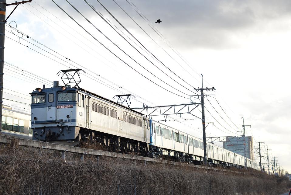 EF65-2096 2014.01.10 甲9866レ 横浜市交通10000系甲種 向日町ー長岡京半逆光のポジション。しかし曇っていながらもバックが明るくてド逆光状態です。色トビしてお話になりません・・・ ケツ打ちはピン甘です。新年お初で師範naoさんに出会えたことが有意義でした。ここに来て頂けたのが嬉しいですねステンレス鋼体の車両は撮影が難しいです