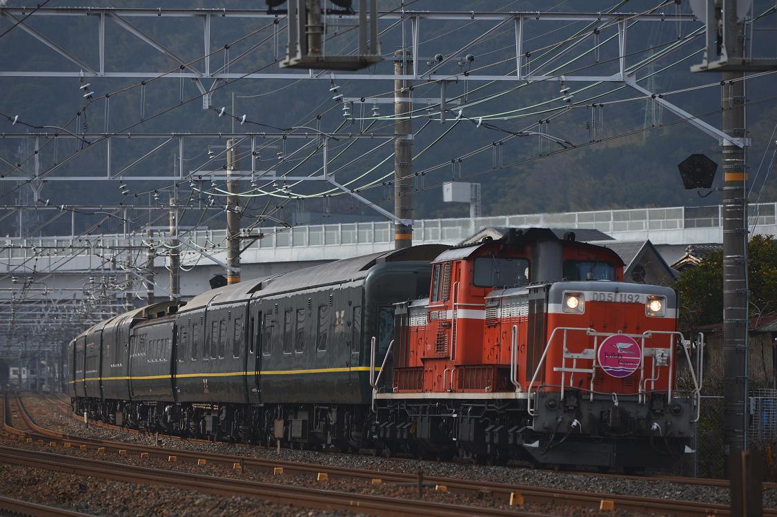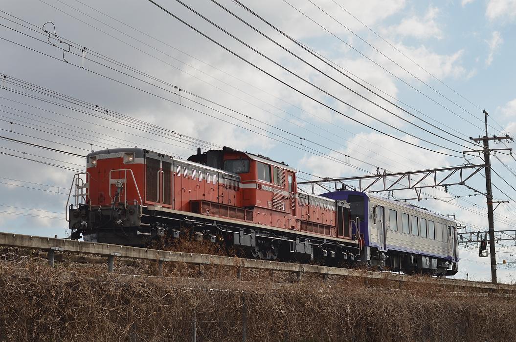 DD51-1192 工9366レ チキ方転回送 2014.01.24 山崎ー長岡京 調子踏切時変試6980Mで工臨は予測出来てました。素直にクロスで下りを撮影に行くべきでした。帰宅してから鉄友S氏から連絡がありました。チキ方転でムコソ出発なら1404に戻ってくる、との情報でした。数年に1度あるらしいですね。どっかの工臨でチキ編成が方転してしまう戻し作業とのことです。せっかくの情報なので光線は厳しい、5087レとの交錯撃沈の可能性、撮影に不利な条件が多かったですが突撃いたしました。