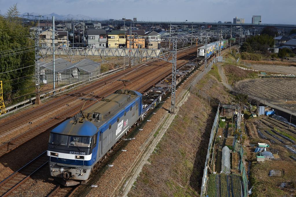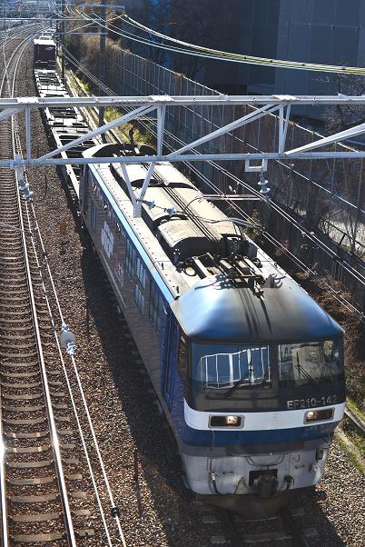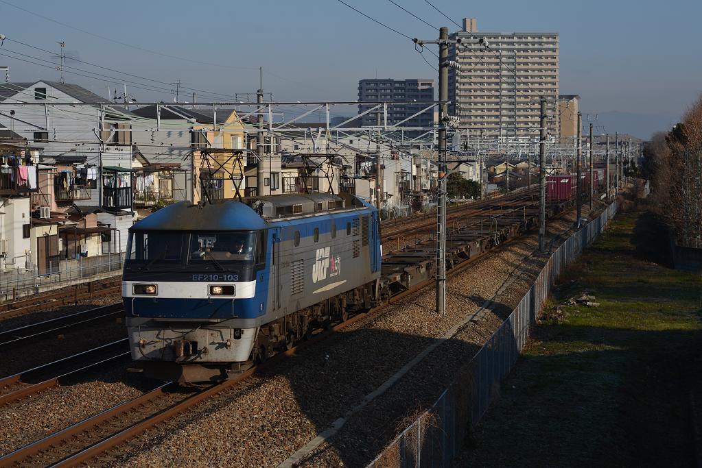 EF210-142 1058レ 2014.01.27 山崎ー長岡京 長岡三中1182レに66-24の情報でしたので折り返しの1881レ、少し前の5087レ、これらを狙うちょい鉄でした。弟が 佃踏切⇒山崎抑止⇒裏山崎 と1881レを追いかけるようでした。私は521系試運転と被る、いわゆる『重症harry症候群』を被弾するのを恐れて長岡三中で構える事にいたしました。弟に車で長岡三中に爆弾してもらって撮影開始。表題は本日の1枚目です。ここでは上り列車は無理ですね・・・1881レ撮影後に弟が山崎から戻るまでに犬川築堤で時間つぶししてました。EF210-148 5074レ 2014.01.27 山崎ー長岡京 犬川築堤ド逆光ではお話になりません。暇つぶしにもなりませんわ。