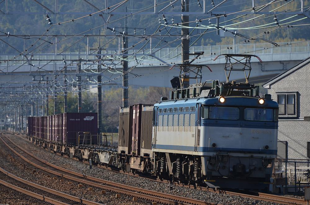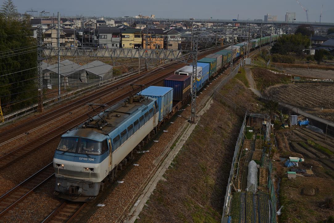 EF210-103 1059レ 2014.01.14 山崎ー長岡京 長岡三中今日は仕事前に東淀川駅で鉄活予定でした。しかし3096レが 81-453無動510-511 とのことで予定変更。押しモモが狙いたいが3096レも・・・、でクロスではなく長岡三中に立ち寄る。まずは表題の1059レです。3096レは定刻には来ません、遅れスジを待っても来ません・・・東淀川はどうでもよくなって11時まで待機しても来ませんでしたあきらめて調子踏切に移動する。4083レからの撮影ですね。ここらで5072レに66-24と判明してラッキーに捕獲出来ました。EF210-147 1072レ 2014.10.14 山崎ー長岡京 調子踏切トワイライト狙いでクロスに移動する。しかし大幅遅延でトワイライトは捕獲出来ませんでした。EF210-108 5081レ 2014.10.14 山崎ー長岡京 名神クロスこれにて仕事に向かいました。が、1182レがPFだったんですね・・・