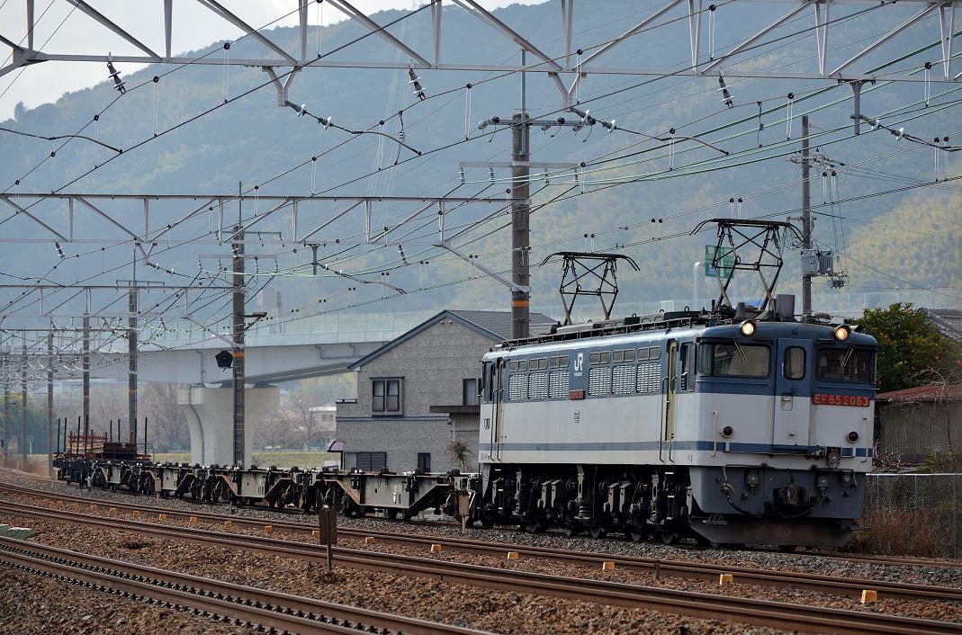 EF65-2063 1182レ 2014.01.23 山崎ー長岡京 調子踏切1182レにPFが入ったので仕事前に突撃しました。編成を確認してから1881レのポイントを決めるつもりでした。コキ4+チキ2でしたのでおそらく1881レはチキを切り離してのコキ4、又は単機と想定。高橋川はやめて曇りを想定しての名神クロスに決めました。もしかしたら最近の1182レでけっこう貯まっているチキの長めの返空があるかもしれませんがきわめて博打な勝負なので高橋川は捨てでした。EF65-2060 5087レ 2014.01.23 山崎ー長岡京 名神クロス5087レ空が空虚な時間です。寒かった・・・本日は上り貨物は全く走ってきませんEF65-2063 1881レ 2014.01.23 山崎ー長岡京 名神クロス若干のピン甘ですわ想定外に長めのチキでありがたかったです。これにて仕事に向かいました。