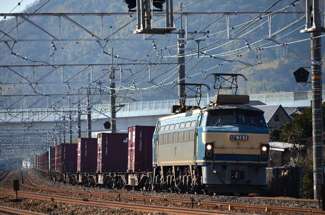 EF66-52 1055レ 2014.01.29 長岡京ー山崎 長岡三中1055レに52号機が入りました。快晴で名神クロスがばっちりなのですが、名神クロスでは3回捕獲しています。違うポイントにいたしました。学校側でもよかったのですが上から叩いてみました。真上ですと機番が見えにくいのでちょいとずらし、右の2本の電柱を1本に重ねる位置にいたしました。