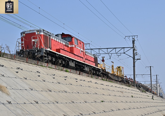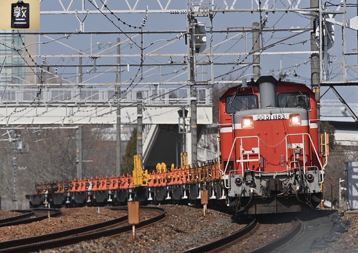 DD51-1183 配8732レ 亀山配給 2025.04.24(木) 長岡京ー山崎 でん裏上 Z8 AFS24-120mm/f4下 Z9 カールツァイスプラナー50mm/f1.4現像して愕然とした・・・ちょうど凸の頭から側面ナンバーのところだけ陽炎でナンバープレートがとろけている。標準レンズ画角でもドサイドでやるのに距離をおくとこうなるのか。こんなことは初めてである。2台の機種で同じ現象なのでピンボケ沈没ではないことは現実です。