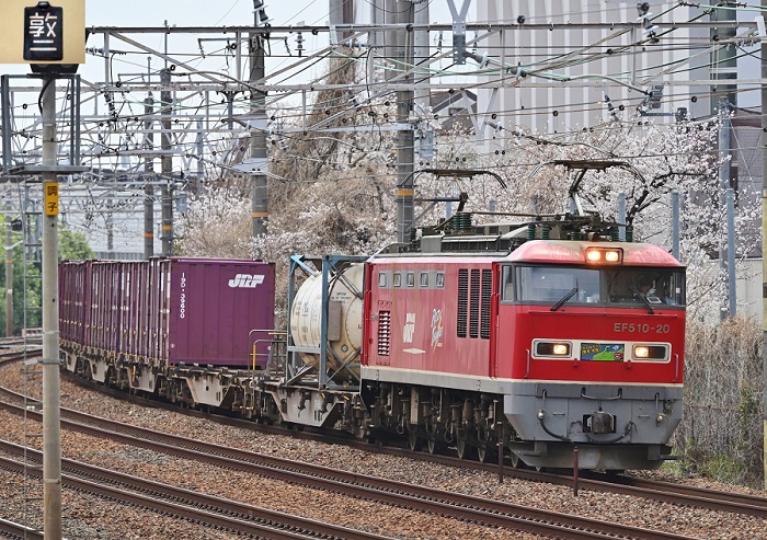EF510-20 3095レ 2025.04.03(木) 山崎ー長岡京やっと20号機が撮影出来る機会でした。もう少し寄って電柱をかわすと桜が削られるので電柱は気にしないことにいたしました。