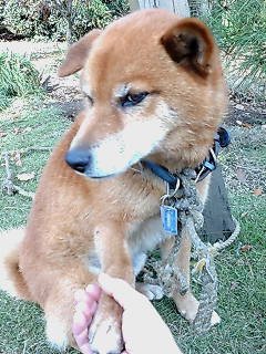 ココの宿には犬が3匹います☆ウチ1匹のワンちゃんと戯れる。みて!!かとー人生初の『お座り』&『お手』成功!!!マジカワイィ(>▽<。あまりにも可愛くて戯れまくる。しかも先輩が言ってもやらなかったんだよ!!!っていうか始めはワンワンワンワン吠えていたのですけど近づいたら即行ソバによってきたw寂しかったんか~♪「そうかそうか」と撫で回す。ドンドンなついてくれて私が離れるとついてくるようになりましたwしかも自分のリードに躓くという可愛らしいオチャメまで見せてくれました(笑)んでちょっとした離れにいるワン太郎がジーっとコッチを見る。ワンワン吠える。尻尾をメッチャ振っている。行きたい、行きたいけどソコは人様の家の中なんだよぉぉぉぉぉ(T□T)かわいそうだから手だけは振っておく。そしたら誰にふっているの?みたいな感じで後を振り返る。お前にふってるんだよぉぉぉぉ!!可愛すぎるよぉぉ><。んで、さっきまで伏せして全く動かなかった老犬が立ち上がったのでそっちへ。。。おいおいおいおい!!!すんげーしがみついてきますけど、このわんこ!!!全くもって可愛すぎる!!!!しかもお手とも言ってなにのにお手をしてくるこのわんこwwwしかもメッチャ力をこめてお手をしてくる。可愛すぎる><。なんかまるで『いかないで!!』って言ってるみたいwwwお手を解くとおかわりをしてくるの!!なもんでカワイイ、カワイイと戯れていたら隣のワンちゃんがすっげー見てる!!なんだよ~!お前もかまってほしいのかぁ~とそっちへ移動。したらわんこがすんげーしがみついてくる!!イヤン、私モテモテ☆とかなんとかほざいていたらワンちゃんが吠えた!!!しかも眉間にしわがよってるよ!!!怖いよ!!!ごめんよ、ホラホラ、怒んなって!!大丈夫だよ!!とあやす。わんこが怯えちゃってるじゃない!!んで先輩達が行くって言うんでかとーも行こうとしたらわんこぉぉぉぉぉぉぉ!!!!何でそんなに力をこめてお手をしてくるんだよ~!!!!離れがたかったじゃないか!!てな感じで今日はモテモテDayでした☆