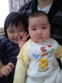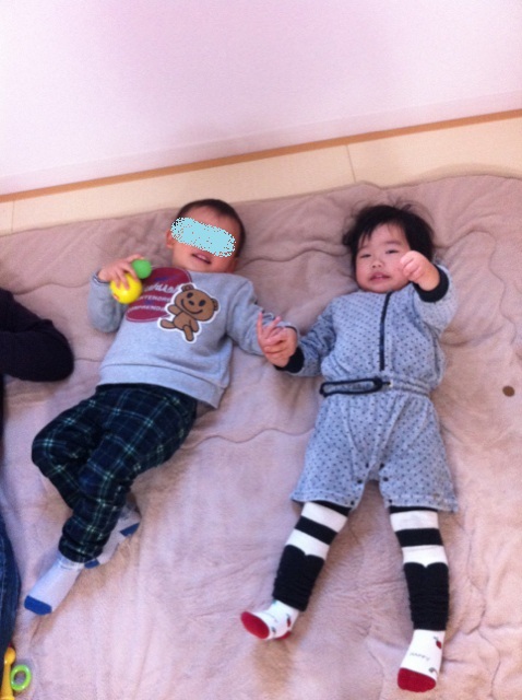 昨日はバスに乗ってお友達のお家に行きました。Hくん、Aちゃん&Hくんママに会いに。Hくんは姫と同い年で妹ちゃんのAちゃんは杏ちゃんと同い年。共通の話題がたくさんあります。Hくんと初めて会ったのは市で行ってる子育て関係の集まり。Hくんも姫も4ヶ月くらいの時です。2人がちょうどAちゃんと杏ちゃんと同じくらいの時です。姫が1ヶ月の入院の末に初めて遊びに連れて行ったとこで知り合い、私もママ友が出来て嬉しかったと思ったことを思い出します。Hくんママとは引っ越す前、買い物する所が一緒で道端でもばったり会うこともよくありました。今はこういう機会を設けないとなかなか会えないのでちょっと寂しいです。 お弁当を買ってHくんのお家へ。2人とも好きなものは一緒。姫が大好物のから揚げをHくん狙ってます。姫は取られないように大事そうに抱えてます。でも、「1個あげたら?」と私が言うとあげようとしていい子です。しかし、結局Hくんは肉まんの方が良かったようで姫はなんだかほっとした様子でした。から揚げ好きはみんな一緒ねから揚げ弁当を買ってあげたけど食べたのはから揚げだけ。いつものパターンです。イチゴも2人は好きで。。出てきたイチゴは2人で争奪戦。ママたちの所には行き渡りません食事が落ち着くと2人で遊ぶのですが…遊ぶ物がかぶって。。。最終的には取り合いでどっちかが泣く羽目に。。姫はアウェイだと弱いので、姫の方が泣いてましたねでもやっぱり男の子の方は強いのかなこうやって成長していくんですね。仲良く遊んでる時はホントに2人ともいい子なんだけどな~ 杏ちゃんは…ついてすぐにおっぱい。そしてしばらくすると泣きはじめ。。何してもダメ。。ずっとおんぶしてたら何とか寝てくれたました。いつもおんぶするとすぐ寝ちゃうけど、昨日は何しても寝てくれず…ママ大変でした来てから帰るまで杏ちゃんはほぼ寝てました。そしてAちゃんはずっと起きてました。全く真逆の2人でした。この2人もこれからたくさん遊べたらいいな~って思いました。いつも退屈の姫でしたが、昨日はお友達と遊べて楽しかったみたい。帰りのバスではぐっすり寝てました。久しぶりに外出して楽しい1日を過ごせました。今日はとても寒いみたいですね。。杏ちゃんの注射が来月から立て続けに続いているので、風邪をひかせることができません。どう遊んでいいのか、毎日毎日悩みます。今日はどうしようかな~ コレは姫です。おばけじゃないよ。。初めての雪遊びは夜遊びです。