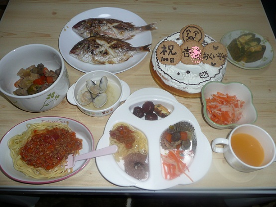 昨日は杏ちゃんの「お食い初め」をしました。ホントは先週ちょうど100日だったのですが、先週はちょっと忙しくてすっかり忘れてました。前日から気合入れて買い出し。タイやハマグリ、お肉などなどいつもの3倍はかかったかな~メニューはタイの尾頭付き…。筑前煮…。蛤のお吸い物…。なます…。赤飯…。それからほうれん草とチーズの玉子焼き、姫の好きなミートボール…そしてパパのリクエストのミートソースとサンマの塩焼き。炊飯器で作ったかぼちゃケーキが並びました。妹も来てくれて、全部並べたらこんな感じになりました。まずはタイから…全く無表情赤飯は…やっぱそんな感じですよね~姫は杏ちゃんにフォークを持たせてくれました。カメラ目線でバッチリです姫は自分のフォークを杏ちゃんにあげたから食べられなくなってしまいましたそして…私が使うはずのフォーク、姫に取り上げられちゃいました。。でも姫はお姉ちゃんね~最後はケーキです。良いお顔。最後はこんな情けないお顔。〆のホーズ。杏ちゃんのお食い初め終了。 杏ちゃんが主役のお食い初めですが…もちろん姫も大はりきりです。ケーキが並ぶと生クリームをペロリ。ジュースに手が伸びる。私が撮影している間、ずっとパパが姫を抑えてました。もちろん撮影中大泣きです撮影後は解禁。まずジュースに手を出してました。杏ちゃんを撮影している横で姫も一生懸命ポーズを取ってかわいかった~まずはピース。では次は笑顔でお願いします。笑顔じゃないけど…笑顔でと言うとこのポーズのようです。無事お食い初めを終えられてほっとしました。 2人とも食べ物に困らない人生を送ってね~